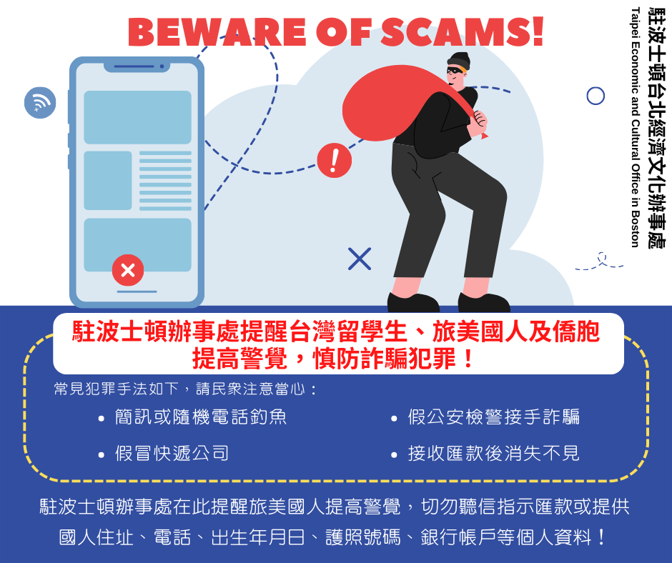近日新英格蘭地區有從台灣初來留學的同學接到詐騙電話,因不了解當地相關作業情況,以致詐騙得逞蒙遭損失。 這類電話詐騙手法通常自稱是國際包裹快遞服務、銀行、領事館或美國政府單位等,並謊稱受話人已身陷錯誤的高額售貨運送、洗錢案、簽證身分問題、即將展開的刑事調查、或其他有嚴重危害的情況,進而要求提供詳細個資,或是提供金錢供其暫管,以解除前述謊稱情況。 請留學生們接到電話詐騙時,切勿聽信指示匯款或提供國人住址、電話、出生年月日、護照號碼、銀行帳戶等個人資料!請在電話錄音或記錄細節後,掛斷電話,自己另行藉由相關單位的官方網站或聯絡方式確認真偽。 若遭詐騙,例如提供了護照資訊,請立刻向我駐美代表處或各辦事處重新申請護照。若其他個資或金錢遭受詐騙,請立即報警並申請止付,同時可向FBI (https://www.ic3.gov/ )報案,並於Federal Trade Commission (https://reportfraud.ftc.gov/ 及 https://www.identitytheft.gov/ )備案,以防範個資遭盜用衍生的法律責任。 此外,切莫懊悔自責,若心理上難以調適,請向學校的輔導諮商或心理健康單位尋求支持。 倘遇緊急狀況,或有重大傷病等急難救助需要,仍請撥打911或本處急難救助專線(電話:617-650-9252);或請國內親友撥打「外交部緊急聯絡中心」,電話:0800-085-095,以即時獲得必要協助。