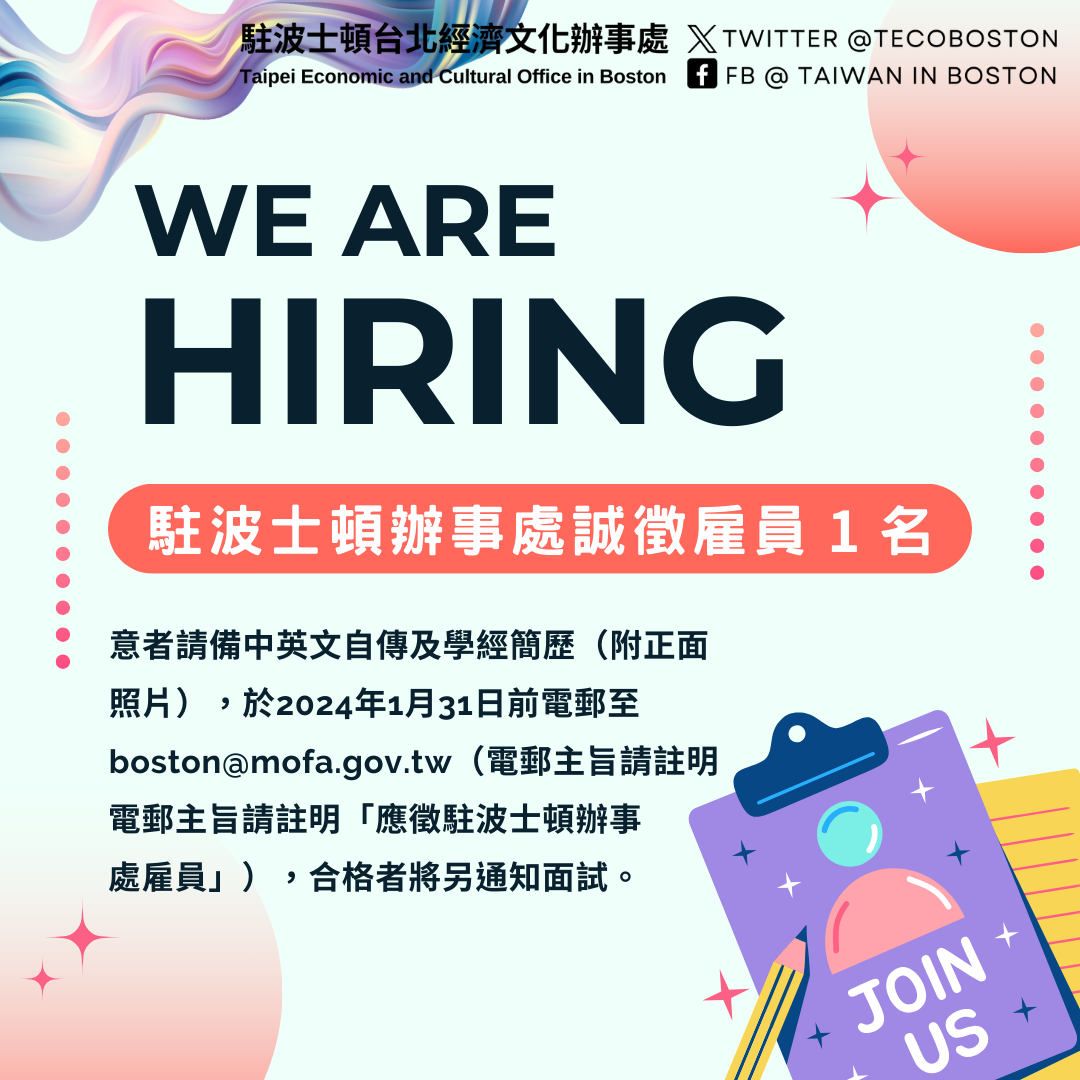 意者請備中英文自傳及學經簡歷(附正面照片),於2024年1月31日前電郵至boston@mofa.gov.tw(電郵主旨請註明「應徵駐波士頓辦事處雇員」),合格者將另通知面試。