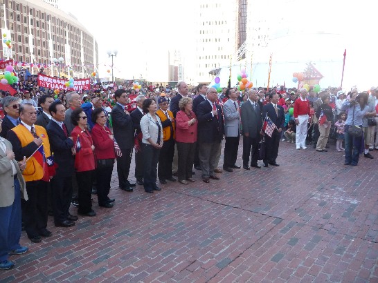 波士頓僑界為慶祝我建國一百年,於100年10月9日(星期天)上午11時在波士頓市政府廣場聯合舉辦升旗典禮,洪處長慧珠及波士頓市長Thomas Menino夫婦等政要、僑領、留學生代表等上千人參加。
