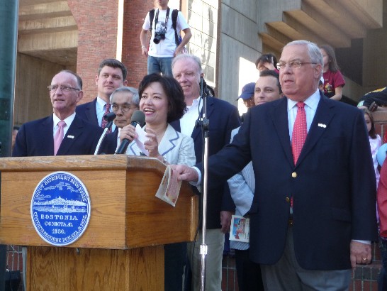波士頓僑界為慶祝我建國一百年,於100年10月9日(星期天)上午在波士頓市政府廣場聯合舉辦升旗典禮,洪處長慧珠及波士頓市長Thomas Menino夫婦等政要、僑領、留學生代表等上千人參加。