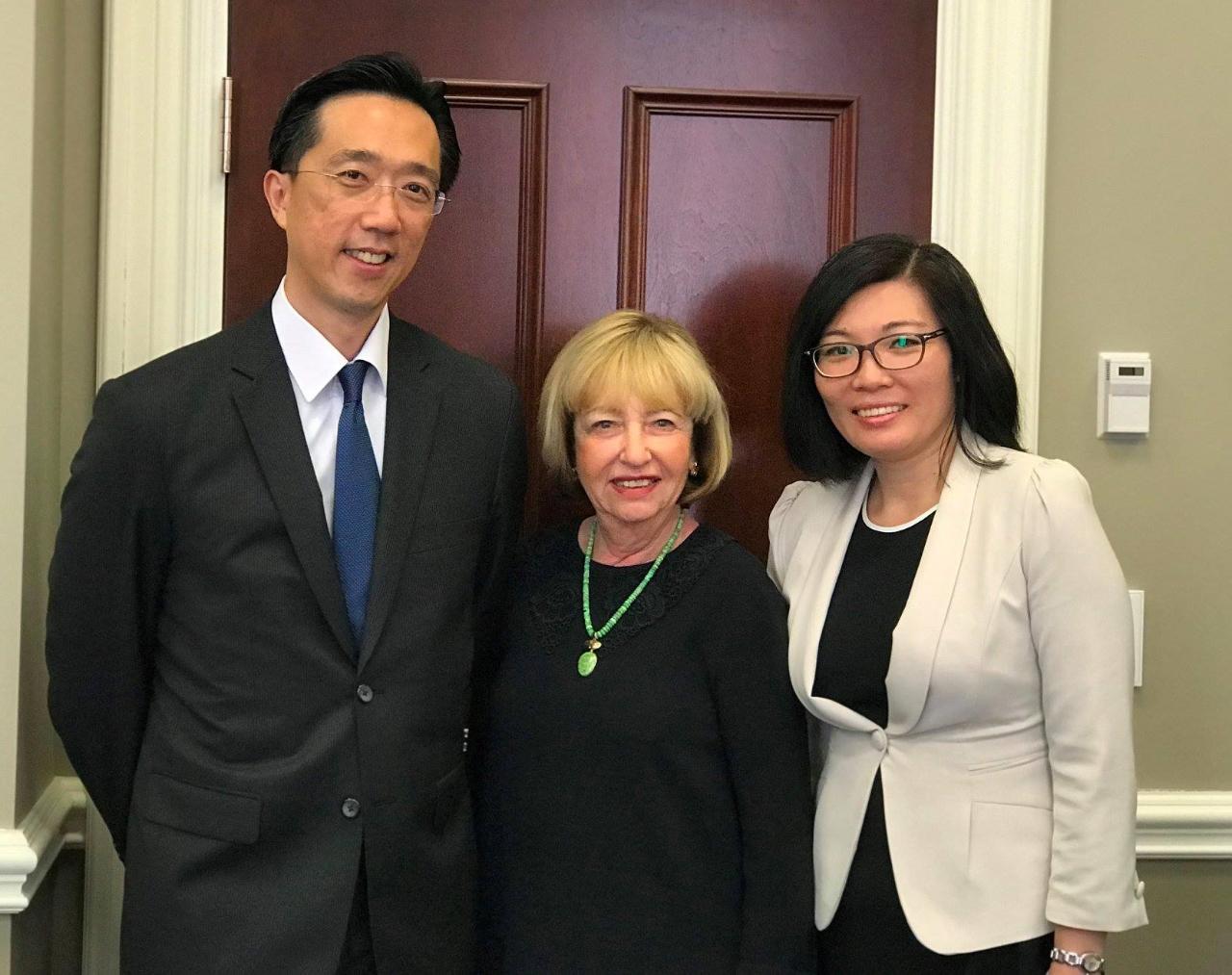 Director-General Douglas Hsu, together with consular officer Johanna Wang, call on Massachusetts Senate Majority Leader, Cynthia Creem at the State House.