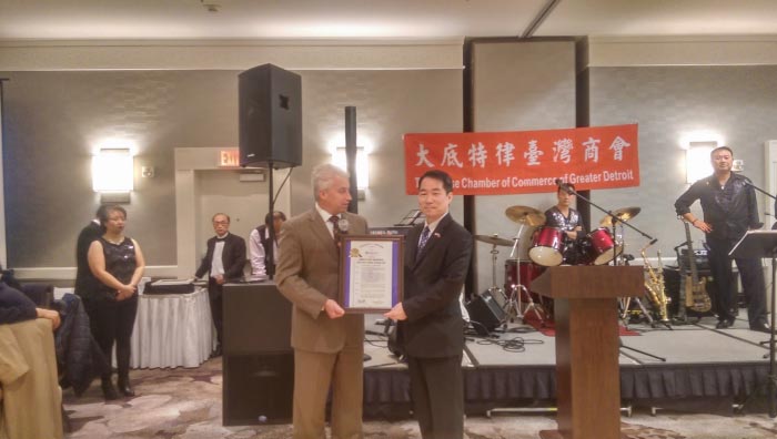 密州大底特律臺灣商會於本(11)月14日在底市西郊里發尼亞市(City of Livonia)萬豪酒店舉行成立20周年慶祝晚會及會長交接典禮,駐芝加哥臺北經濟文化辦事處處長何震寰應邀出席並擔任卸任會長李維灝及新任會長傅曼玲交接典禮之監交人。韋恩郡郡長伊凡斯(Warren Evans)、副郡長李俊(June Lee)及郡議員拉布朗克(Richard LeBlanc)等多位當地政要出席,密西根州州長史奈德(Rick Snyder)、聯邦眾議員Dave Trott亦指派代表到場致送賀詞。