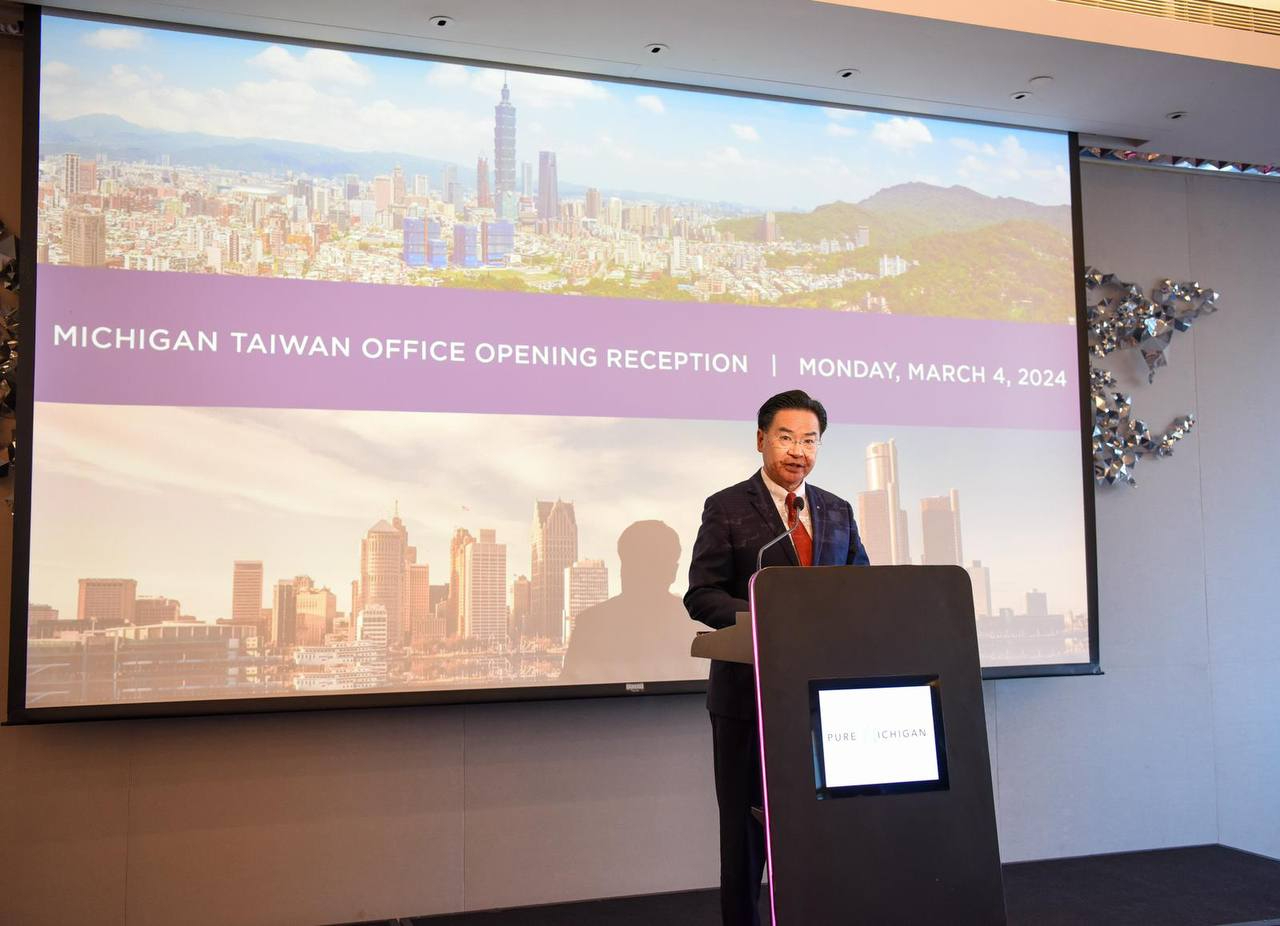 外交部長吳釗燮於4日晚間應邀出席密西根州駐台辦事處開幕酒會時致詞表示,密州是美國汽車工業重鎮,台灣為密州在亞洲的第5大進口來源市場及第6大出口市場,且具半導體晶片製造及相關產業優勢,可成為密州緊密的供應鏈夥伴。魏美桂州長選擇於此時成立駐台辦事處,為雙方促進產業及經貿交流的絕佳時機。