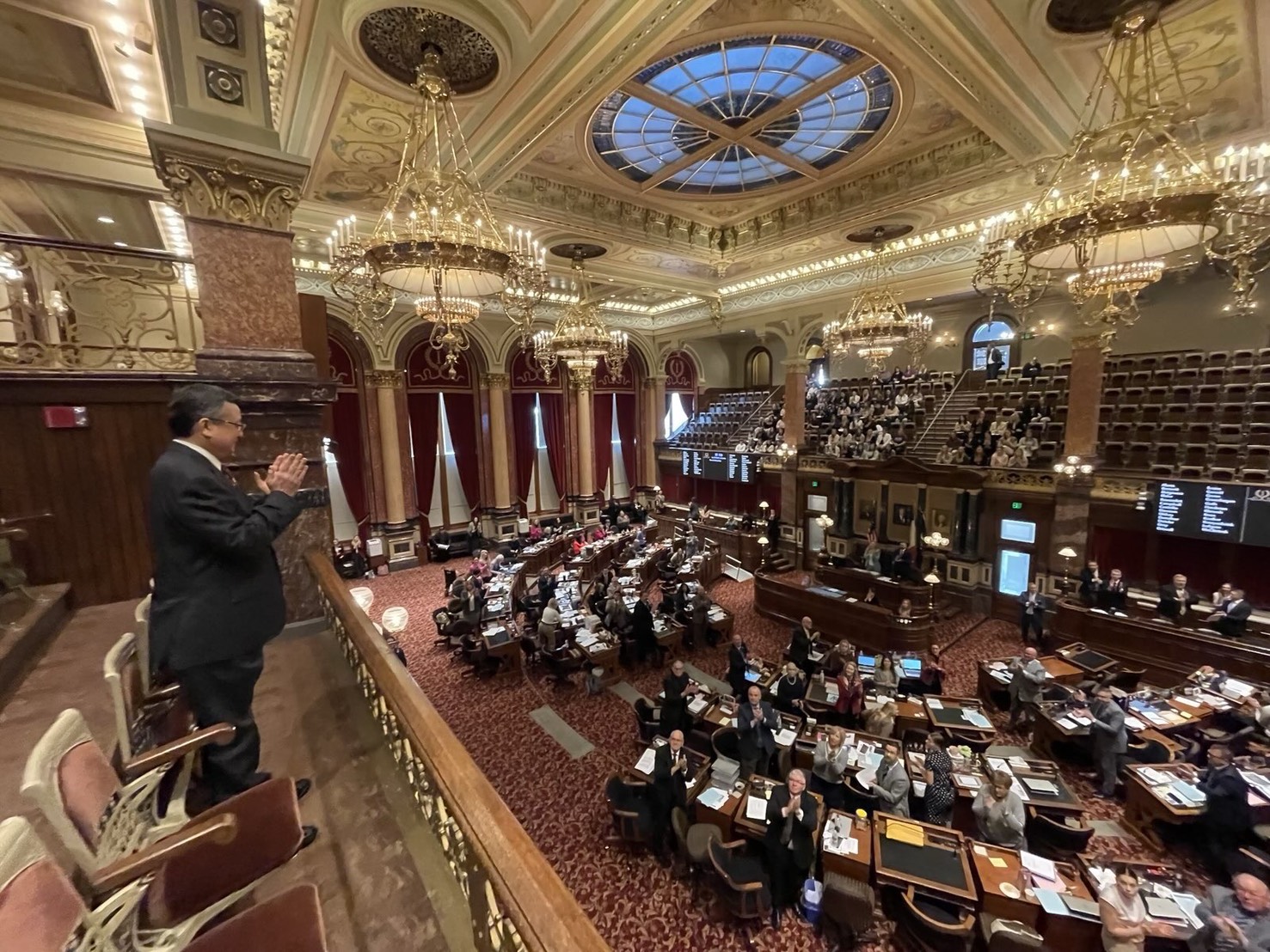 圖一、二:駐芝加哥辦事處類總領事延峰赴愛荷華州參、眾議院見證友台決議案獲無異議通過,並接受現場議員歡迎。