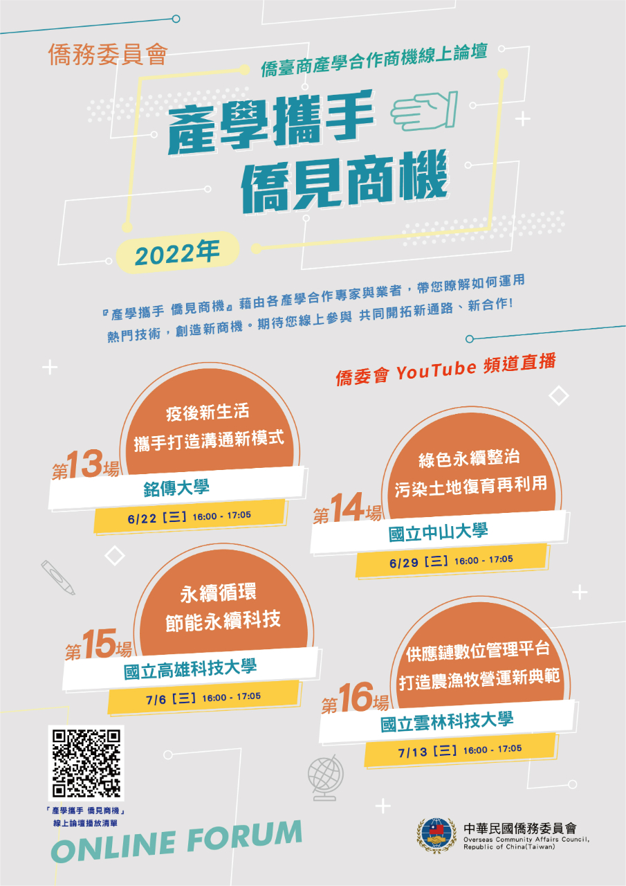 僑務委員會為協助全球僑臺商建構與國內產學研發單位的合作網絡,特別推出「產學攜手 僑見商機」線上論壇,分別以參與僑務委員會「全球僑臺商產學合作方案」之各大學校院國際產學合作機構為單元,並邀請相關優質企業廠商分享產學合作經驗,期協輔全球僑臺商企業因應環境變革轉型發展,並協助國內產學研發單位開拓國際市場。