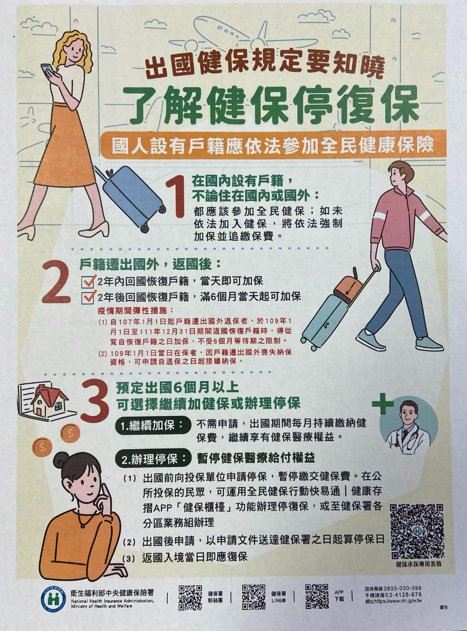 衛生福利部中央健康保險署表示,邇來迭有自國外返臺辦理恢復戶籍民眾,因不知設籍後應參加全民健康保險,或在臺設有戶籍未完成投保手續及選擇是否辦理停保即出境,致事後遭追繳5年內保險費,為提醒民眾設籍後應依法參加全民健保及出國6個月以上得選擇停保相關規定,爰檢送「出國健保規定要知曉了解健保停復保」宣導單張如下,請僑民參考,以保障自身健保權益。