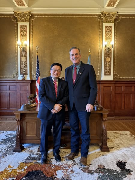 2月25日黃世昌處長親赴南達科他州面賀羅登(Larry Rhoden)州長就任新職,雙方並就台美穩固篤密的經貿與安全合作議題,包括如何促進台灣和南達科他各方面的交流與合作廣泛交換意見。羅州長藉機感謝黃處長任內致力推動彼此經貿與教育合作,促成渠上年率經貿團訪台,並祝福黃處長更上層樓。