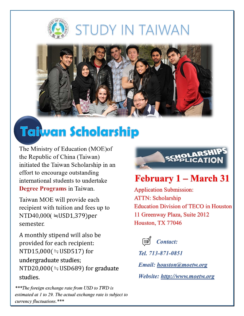 The Taiwan Scholarship is provided by Taiwan’s Ministry of Education to encourage American students from Colorado, Kansas, and Missouri to undertake degree programs in the Republic of China (Taiwan).