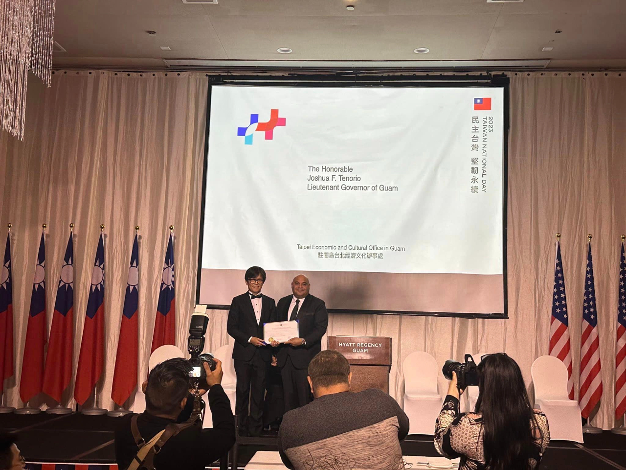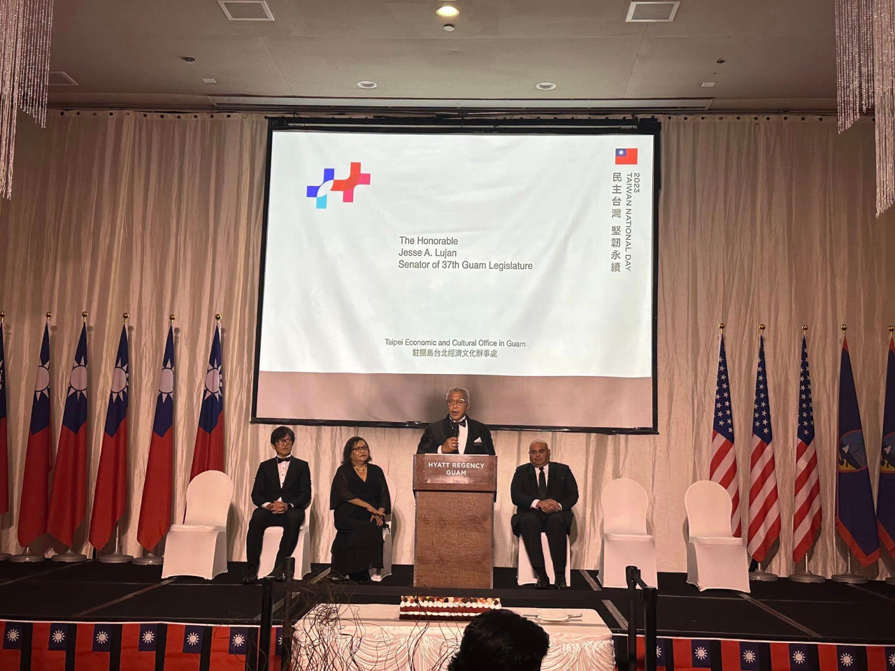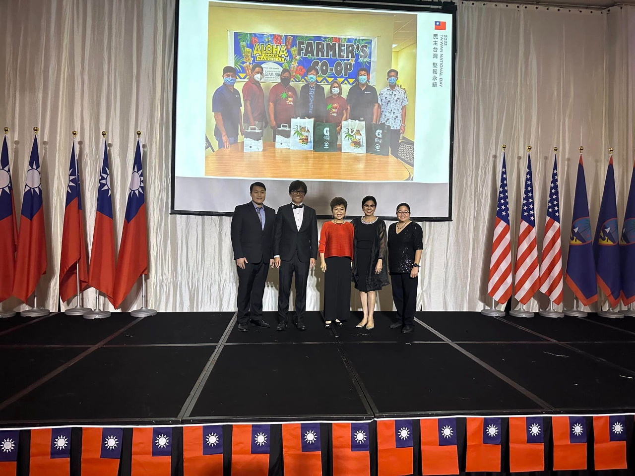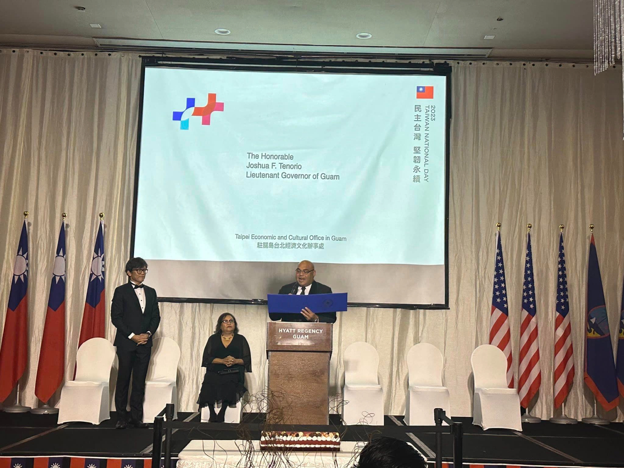 本處於本(10)月6日在關島凱悅酒店盛大舉辦本(112)年國慶酒會,現場嘉賓雲集,共有帛琉副總統兼司法部長席嫵杜(J. Uduch Sengebau Senior)、美國關島副總督譚里諾(Joshua F. Tenorio)、關島議會議員等總共300位政、商、學、僑界賓客出席,關島總督府及關島議會也分別頒贈賀狀及決議同慶中華民國(台灣)112歲生日。曾經在去年及今年訪台的關島副總督譚里諾和關島議會議員盧罕(Jesse A. Lujan)都表示,駐關島辦事處復設3年以來積極強化台關政府及人民交流,尤其在關島面對COVID-19疫情和「瑪娃」颱風災情期間伸出援手,關島政府表達由衷感謝。酒會現場另設有金車噶瑪蘭威士忌品酒攤位,讓賓客享用世界知名的台灣美酒,而關島大學校長安莉克絲亦在致詞中宣布,由關島大學、國立台東大學及國立台灣文學館聯合舉辦之「台灣-關島南島國際藝術展」在當晚正式揭幕,展出南島原民精彩的藝術創作作品,展期至10月10日止,為本處國慶酒會增添不少台灣文化特色。