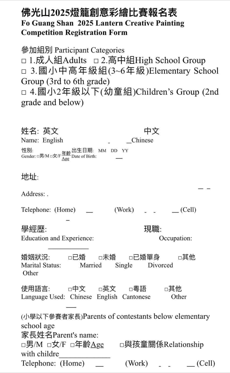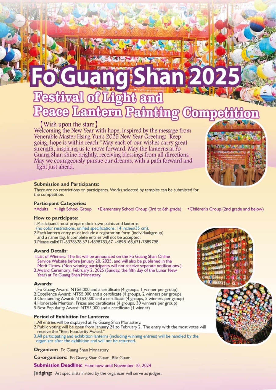 【星語心願】懷抱希望迎接新年的到來,正如星雲大師2025年新春賀詞「向前有路,光明在望」的祝福,但願每個心願都能帶著強大的力量,激勵我們向前行;也誠盼心願燈籠在佛光山上閃耀,接受來自四面八方的祝福,祝福大家都能勇敢追夢,向前有路,光明就在不遠的前方。【收件對象】:參賽對象未設限,全部都可參加,各道場可挑選優質作品參賽。【參賽組別】:成人組國高中組國小組(3至6年級)幼童組 (2年級及以下)【参賽方式】:1.顏料及燈籠自備(不限顏色,規格統一 : 14吋/35公分)2.寄回作品需含報名表及吊牌,缺一恕不受理(個人/團體造冊)3.洽詢電話(671)6378678, 4898783, 4898168, 7889798【得獎須知】:1.得獎名單:將於2025年1月20日前公告於佛光山全球資訊網,並刊登「人間福報」。(未得獎者,不另行通知)2.頒獎時間:2025年2月2日星期日(大年初五)於佛光山寺。【獎勵辦法】1.佛光獎:新台幣6,000元、獎狀(共4組/每組1名)2.特優獎:新台幣5,000元、獎狀(共4組/每組2名)3.優等獎:新台幣2,000元、獎狀(共4組/每組5名)4.佳作:獎品、獎狀(共4組/每組30名)5.最佳人氣獎:新台幣5,000元、獎狀(1名)【展出期間】:1.所有參賽作品將展示於佛光山寺。2.展示期間2025年1月24日至2月2日開放民眾投票,得票最多者獲「最佳人氣獎」。3.所有參賽作品燈籠(含得獎者)展出後由主辦單位處理,恕不領回。【主辦單位】:佛光山寺【協辦單位】:關島佛光山、國際佛光會關島協會【收件日期】:即日起至2024年11月10日截止【作品評選】:由主辦單位聘請藝術專家擔任評審