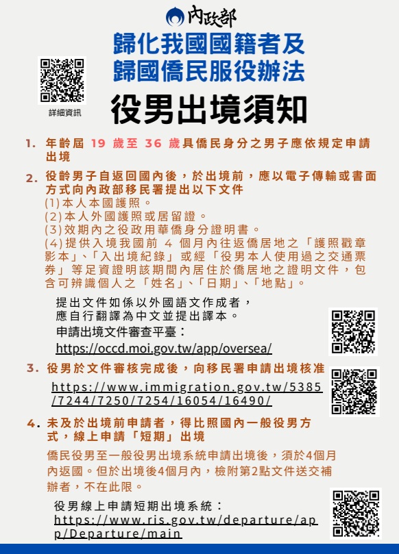 為配合當前兵役政策、維護兵役公平,內政部於本(114)年9月5日修正發布「歸化我國國籍者及歸國僑民服役辦法」,並於9月8日施行,相關資訊已公告於該部役政司官網主題單元-僑民役男專區。此次修正重點:ㄧ、取消「僑居身分加簽護照」作為僑民役男身分認定文件,僅採認以僑務委員會核發「役政用華僑身分證明書」作為僑民役男認定依據。二、僑民役男返臺居住達183天需辦理徵兵處理。三、以僑民役男身分出境,需檢附相關證明上網提交;仍可至移民署各地服務站申請。如有役政相關疑問,請洽內政部役政司:https://dca.moi.gov.tw/chaspx/menulist.aspx?web=382 如有「役政用華僑身分證明書」相關疑問,請洽僑務委員會:https://dca.moi.gov.tw/chaspx/menulist.aspx?web=382