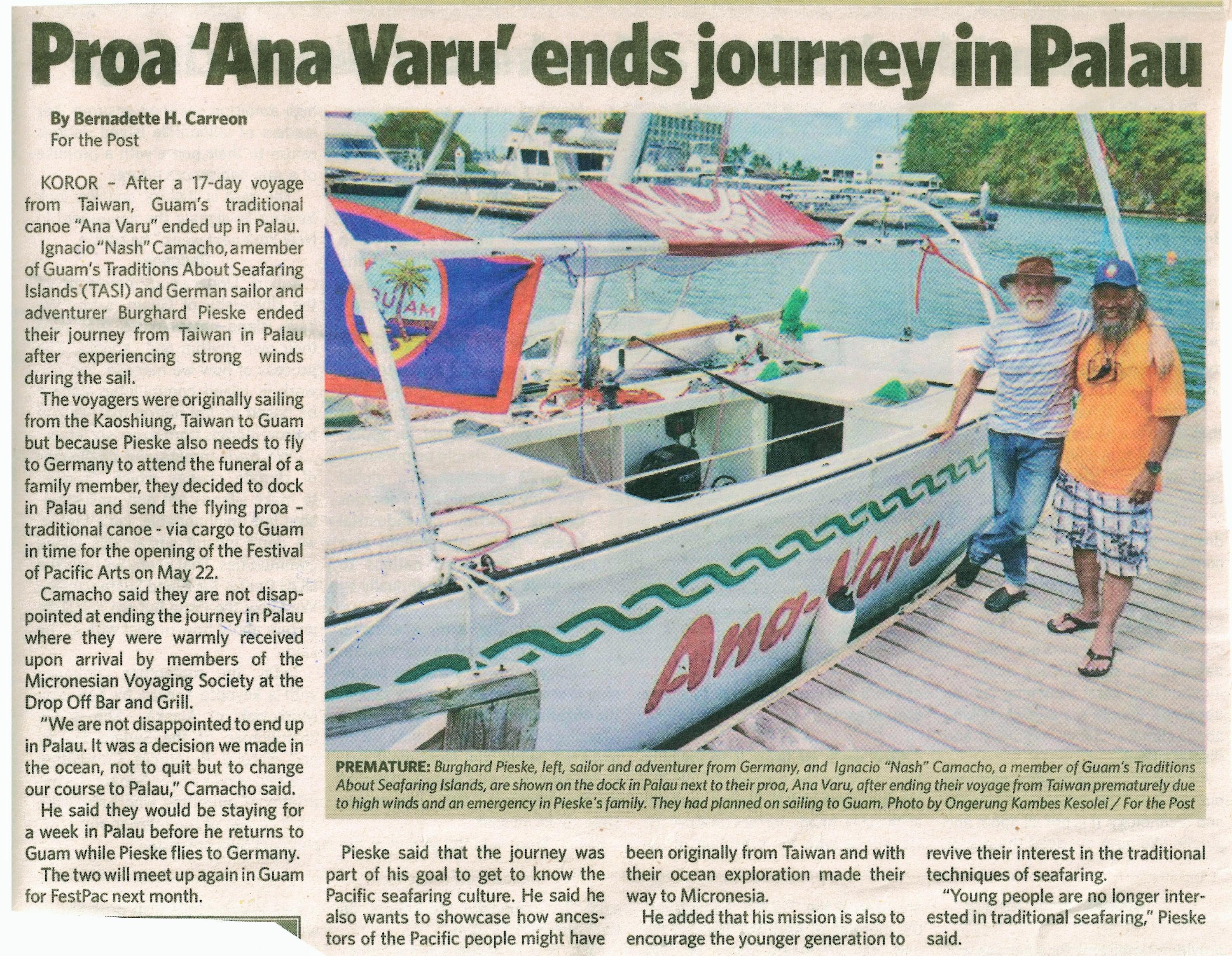 關島主要報紙Guam Daily Post於本(4)月14日在本地新聞欄以大幅版面報導Ana Varu號獨木舟航行之消息: