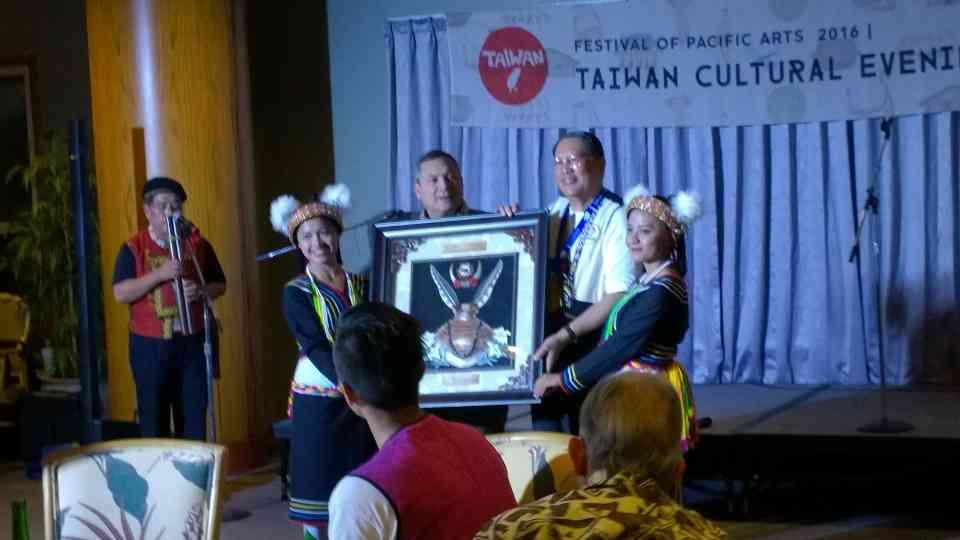 我原住民族委員會林前主委江義於晚會中代表我原住民族委員會致贈關島總督我原住民創作之藝術品,感謝關島政府邀請我代表團參加第12屆太平洋藝術節。晚會在我原住民代表團之舞蹈及歌唱表演中劃下完美句點並期待下次再相見。
