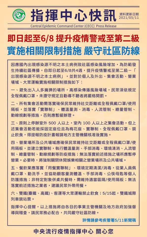 為因應國內出現感染源不明之本土病例致社區感染風險增加,並為防範社區感染,中央流行疫情指揮中心頃於本(110)年5月11日宣布,自即日起至本年6月8日,提升我國疫情警戒至第二級-「出現感染源不明之本土病例」,並實施相關限制措施,以嚴守社區防線