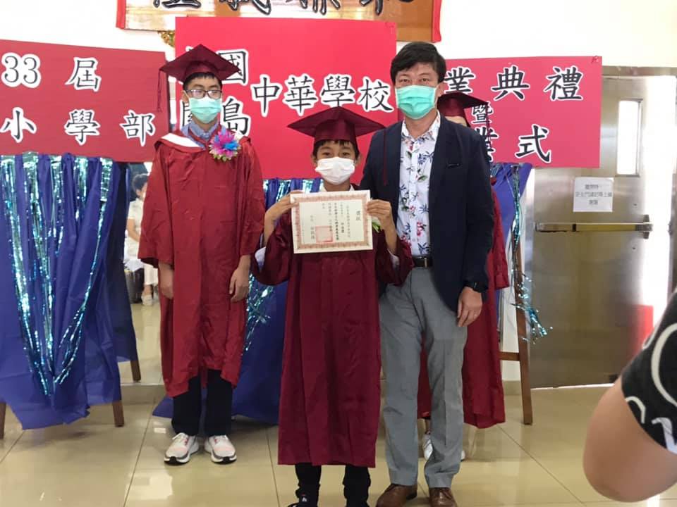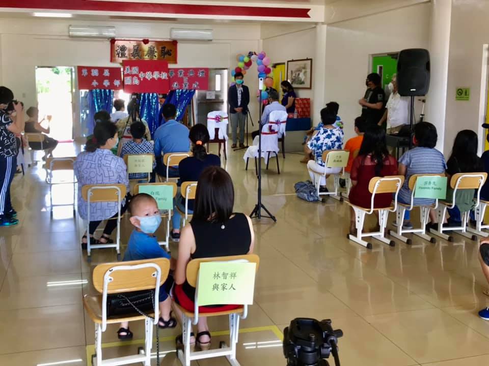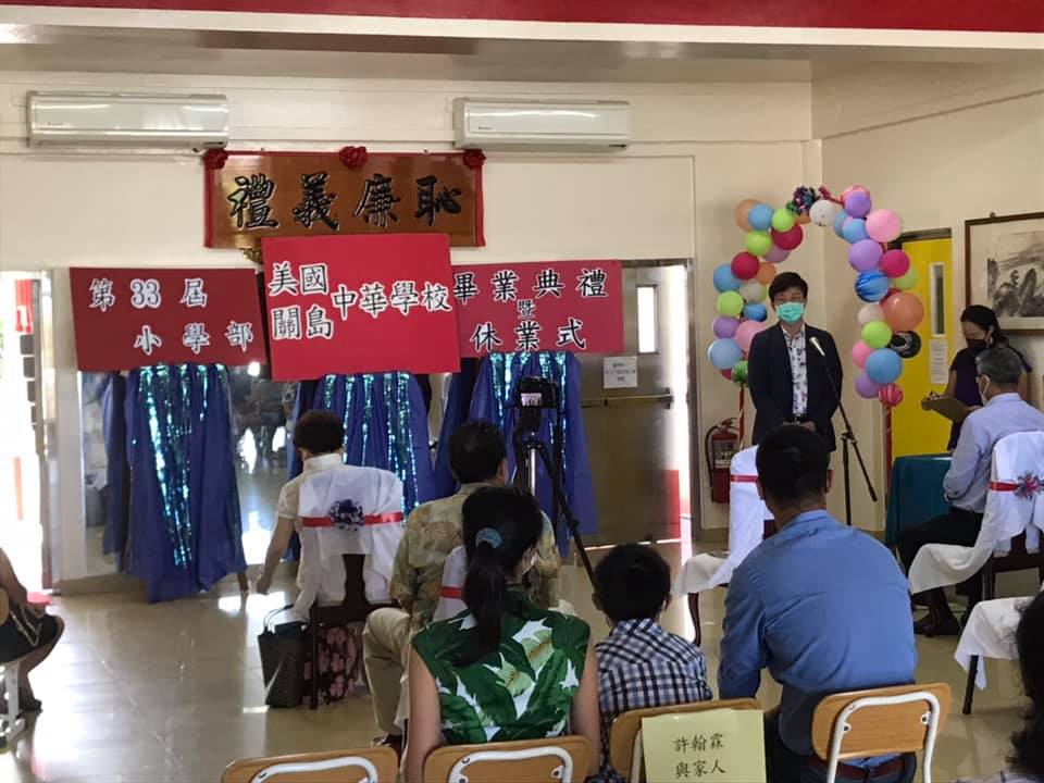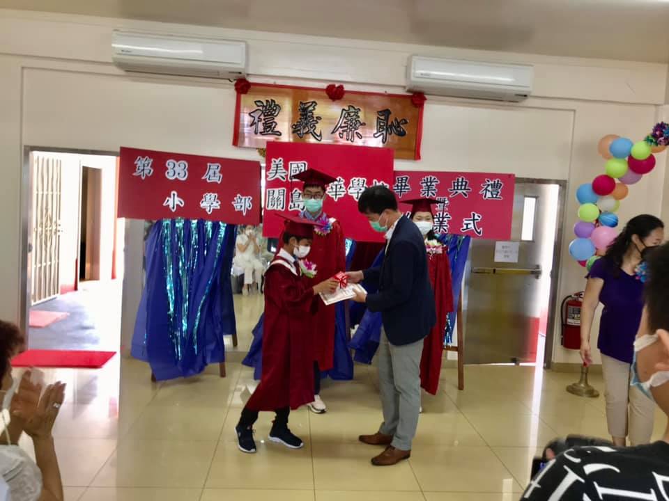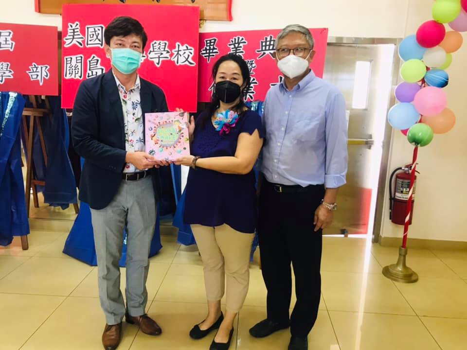 110年5月29日本處陳總領事盈連應邀出席關島中華學校小學部第33屆畢業典禮暨結業式,陳總領事在致詞中勉勵畢業生畢業後繼續努力學習中文並恭喜他們學業有成,典禮中陳總領事另頒贈本處處長獎予一得獎小朋友,典禮結束後陳總領事捐贈「新冠肺炎大解密」防疫中文繪本3本予該校,由該校基金會董事長徐凱援及李老師代表接受。