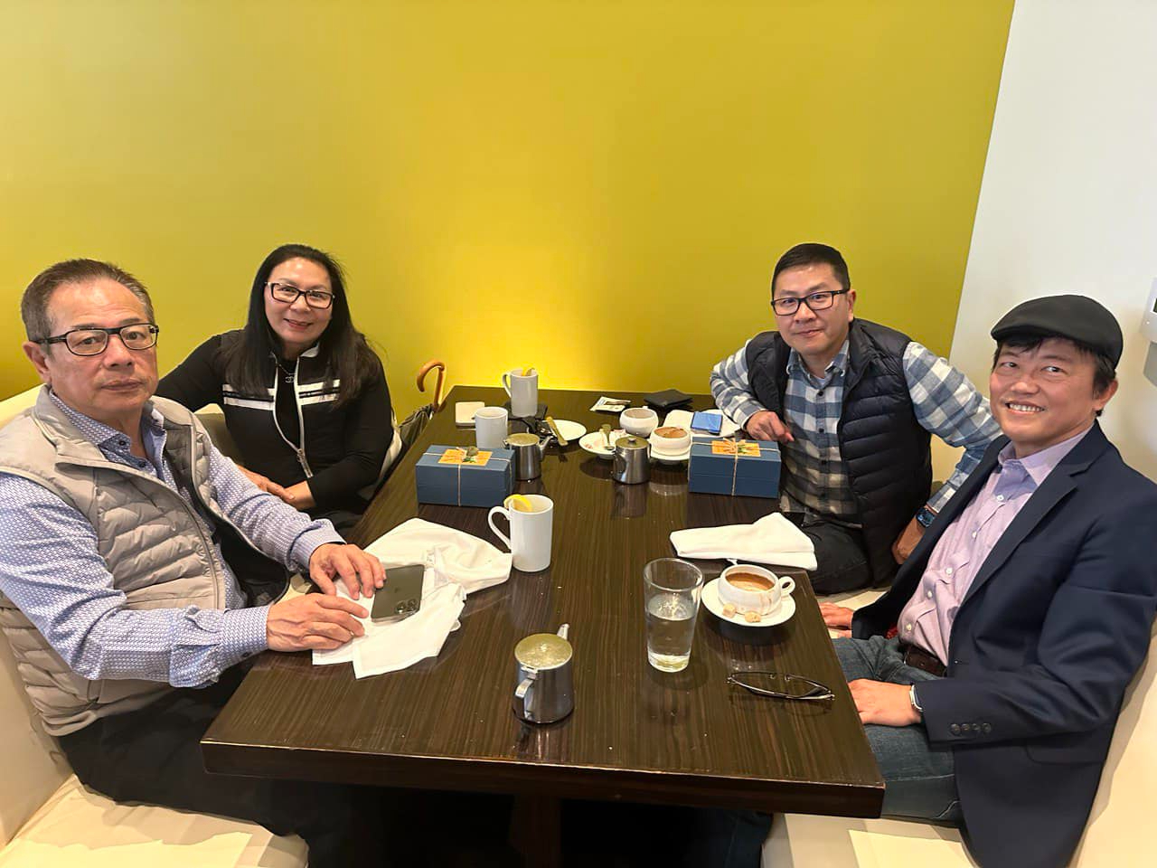 本處陳總領事盈連與僑務諮詢委員呂世豪(前左)、北美洲台灣旅館公會聯合總會理事長汪蔚興(後右)、南加州台灣旅館業同業公會秘書長柯欣侑(後左)餐敘