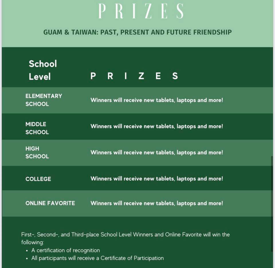 Hafa Adai! “Guam-Taiwan Art Drawing Contest” will kick off this month. The contest consists of four categories for participants, ranging from elementary school to college. Join now and you will have a chance to win amazing prizes, including tablets and laptops. The award ceremony will be held April 10 at the Micronesia Mall. Great opportunity for you. For more details, please contact your school or call Grace Valencia at 488-7334. Thank you.
