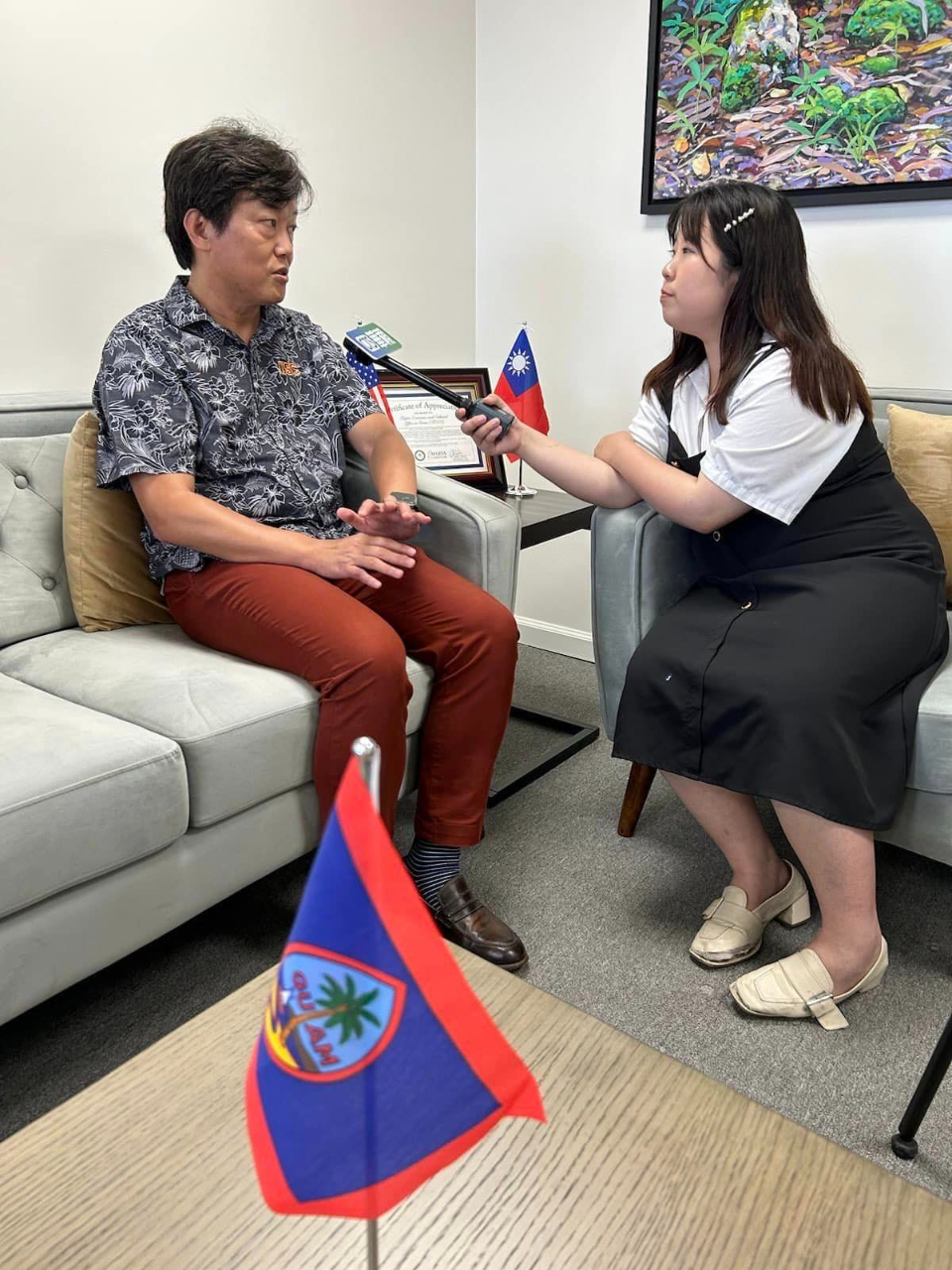 Felix Yen, Director of the Guam Taiwan Office, along with Viola Yeh, reporter from CNA, Li-Ting Fang, reporter, and Jian-An Chen, cameraman, from CTS News, paid a visit to TECO and conducted an interview with Director General Paul Chen on Jul. 20