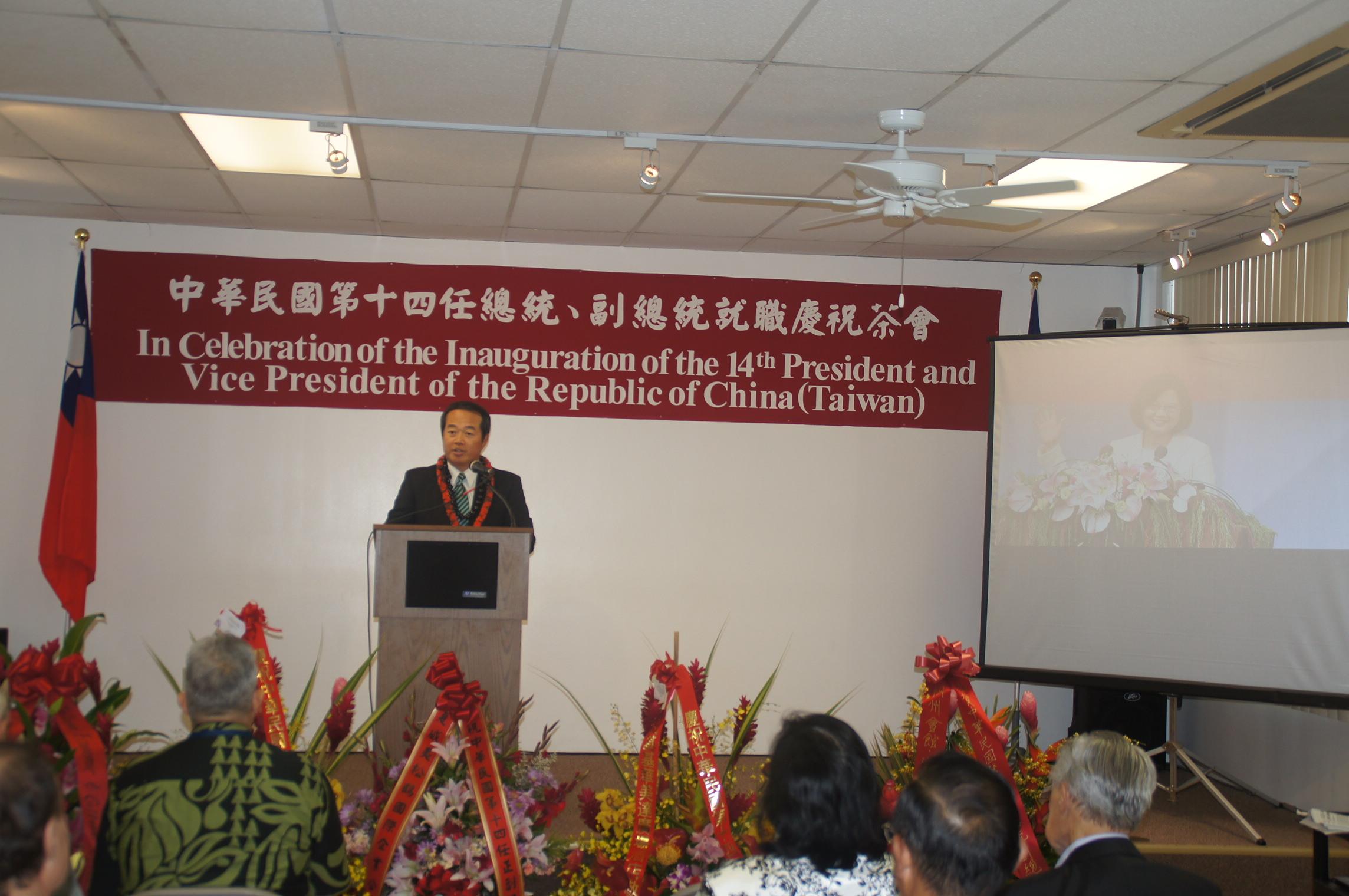 謹代表夏威夷第一選區,誠摯祝賀台北經濟文化辦事處與本地僑民共同慶賀蔡英文總統、陳建仁副總統就職大典,本人要向台灣人民於歷史性時刻獻上誠摯的感謝與祝福。