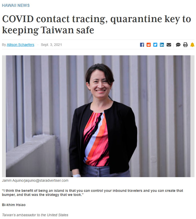 駐美國代表處蕭美琴大使訪問夏威夷期間接受檀香山星廣報專訪,提到中國對台灣的「灰色地帶威脅」,表示台灣與美國具有共享價值及利益,強調台美關係持續發展緊密關係對台灣非常重要。蕭大使也分享台灣防疫經驗,介紹台灣國產疫苗「高端」,並感謝美國捐贈台灣疫苗。