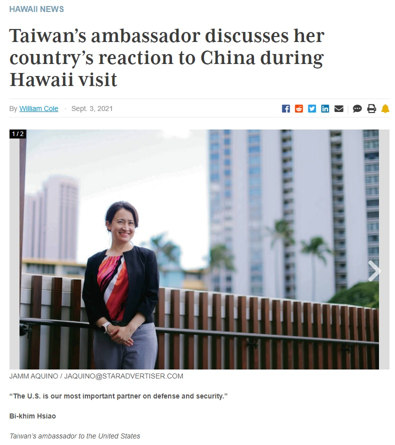 1. 台灣大使訪夏期間談論台灣對中國的因應之道 (Taiwan’s ambassador discusses her country’s reaction to China during Hawaii visit)