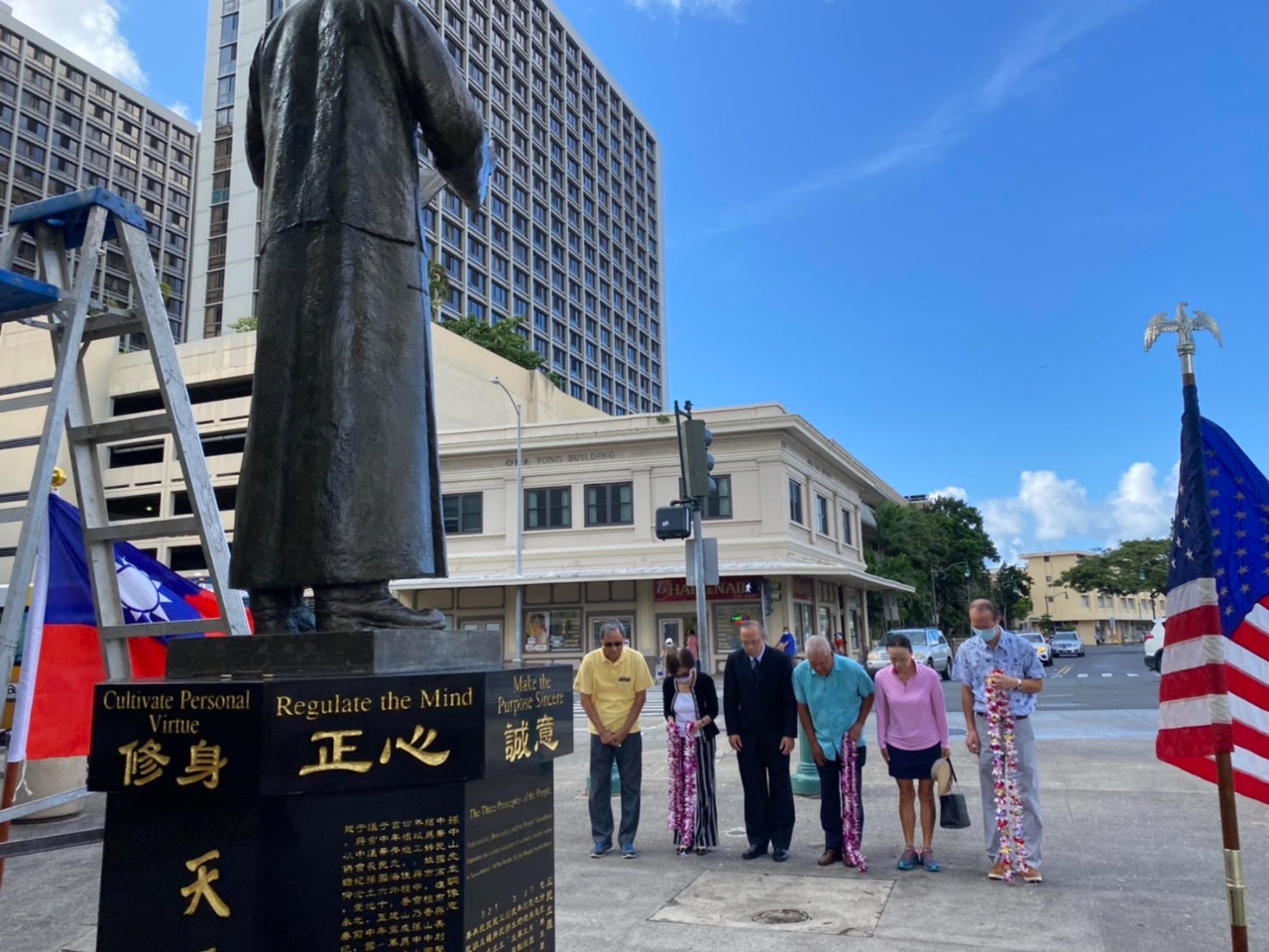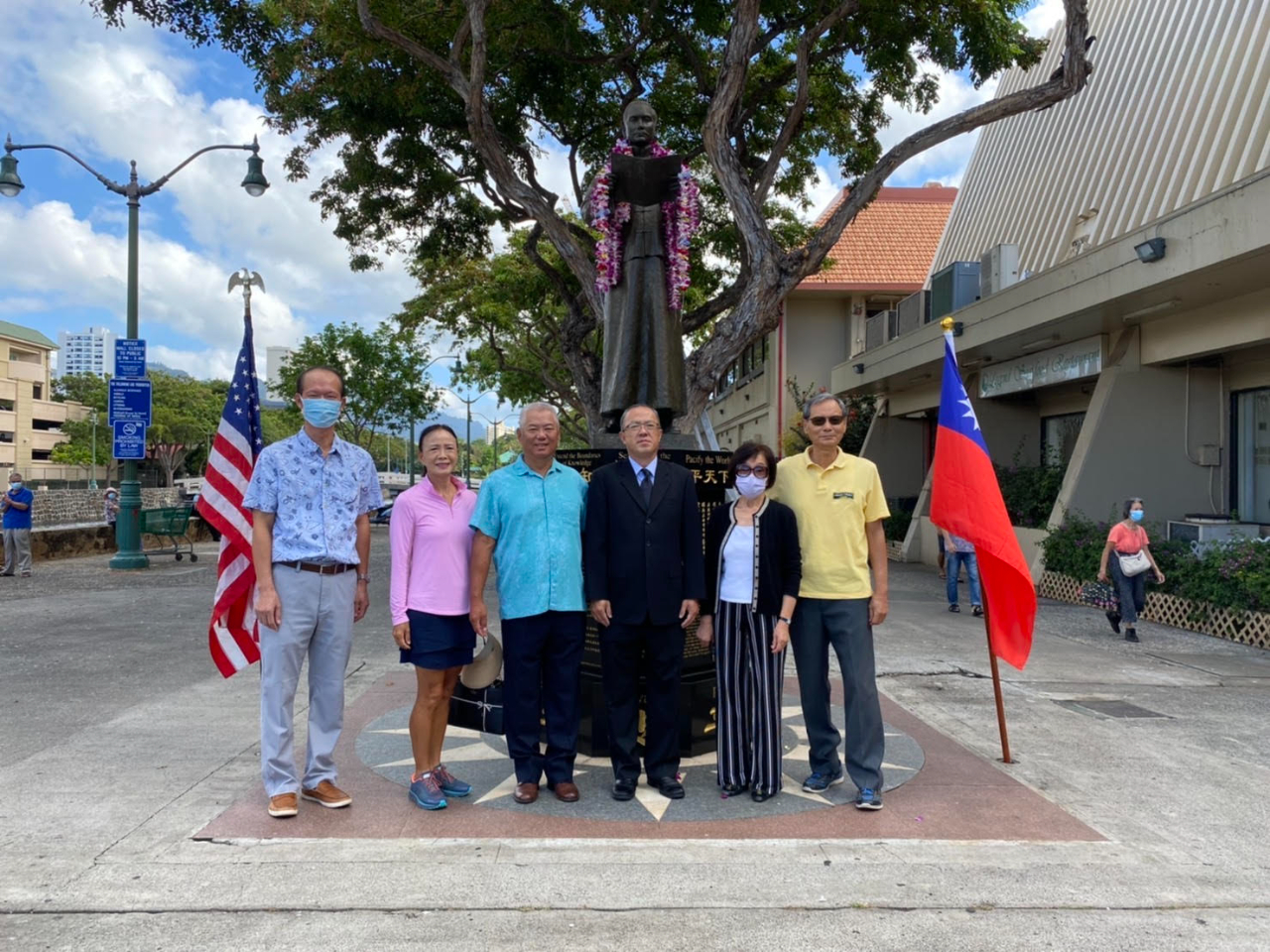 本(2021)年11月12日為國父孫中山先生156歲誕辰紀念日,駐檀香山辦事處應中國國民黨駐檀香山總支部前主席、趙僑務諮詢委員光斗邀請,由鄒組長元飛代表曾總領事永光、偕辦事處同仁出席在華埠文化廣場向國父銅像獻花儀式,另夏威夷地區何僑務委員文祥、王僑務促進委員月杏亦代表僑界出席,儀式簡單隆重,以符合檀香山市政府相關防疫規範。