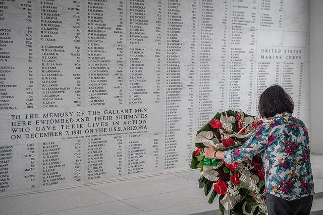The USS Arizona Memorial, located on the island of Oahu in Hawaii's Pearl Harbor, was built over the remains of the sunken battleship USS Arizona, sunk by the Japanese during the attack on Pearl Harbor. As a tribute, the names of the crewmen who died aboard the USS Arizona are inscribed on a wall inside the memorial.