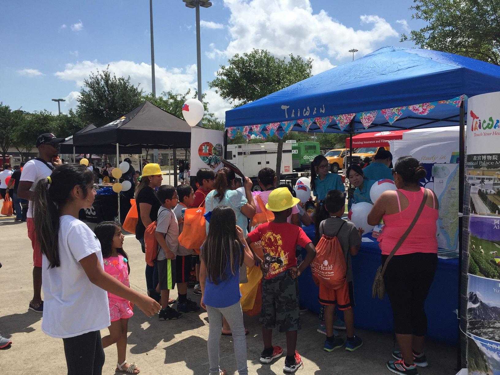 今年是駐休士頓台北經濟文化辦事處教育組(以下簡稱教育組)第三度受邀參展,這次的攤位佈置融合了台灣客家花布三角串旗,透過視覺陳列凸顯台灣當地特色;立體的台北101模型展示,讓小朋友認識台灣現代化科技實力。在活動方面,除向學生介紹留學台灣資訊及獎學金機會外,工作人員也與學生及家長互動,答對台灣常識問答者即獲贈印有國旗圖案汽球,同時讓小朋友大展身手自己動手灌汽球,看誰可在最短時間內將汽球充滿氣體,小朋友從中獲得滿滿的自信,玩得不亦樂乎,也藉由遊戲互動瞭解台灣及獲得未來留學台灣的相關資訊。