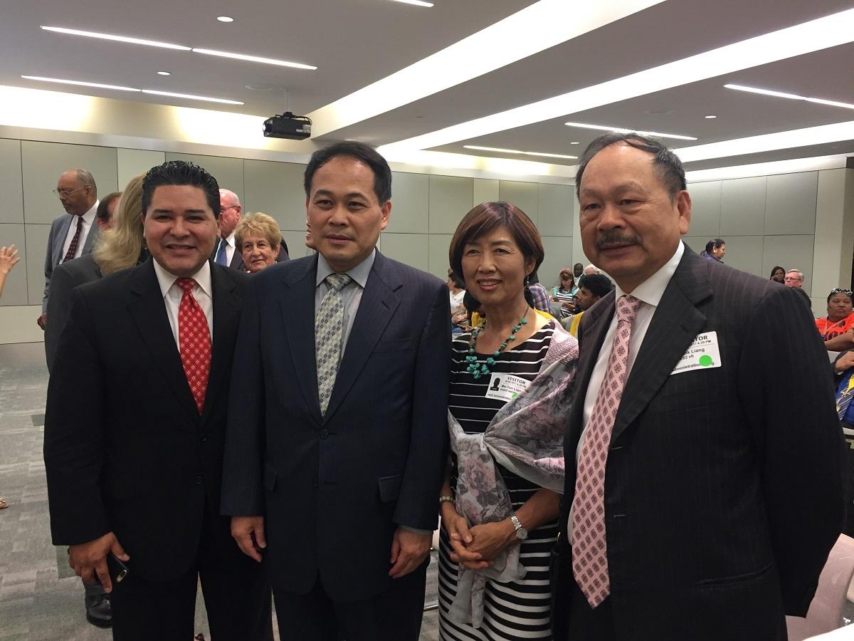 (左至右):HISD學區總監Richard Carranza;駐休士頓辦事處處長黃敏境;休士頓台灣商會會長梁慶輝夫婦