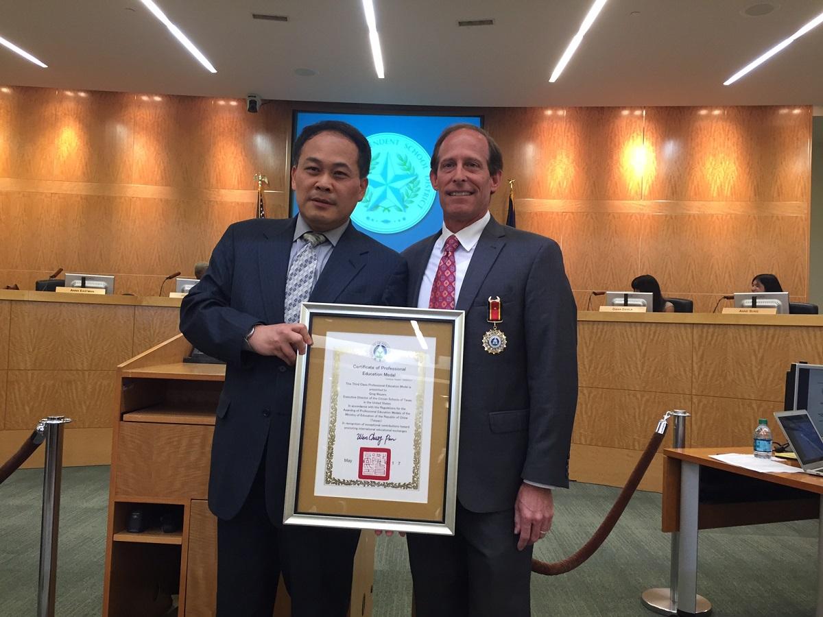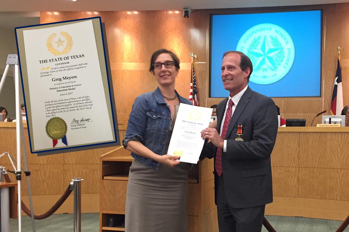 在休士頓獨立學區(Houston Independent School District, HISD)擔任了12年教育委員的Greg Meyers,自2013年起與駐休士頓台北經濟文化辦事處教育組建立教育夥伴關係,促成許多台美間教育合作案,嘉惠雙邊教師與學生。