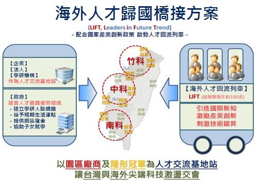 科技部於106年7月正式推出「海外人才歸國橋接方案(LIFT, Leaders in Future Trend)」,預計號召100名於海外具博士學位之具中華民國籍45歲以下人才回國服務,同步在三個科學園區設置「人才交流基地站」,協助海外返國學人與產學研界進行專業交流活動,期望藉此激勵產業創新及國內技術提昇。