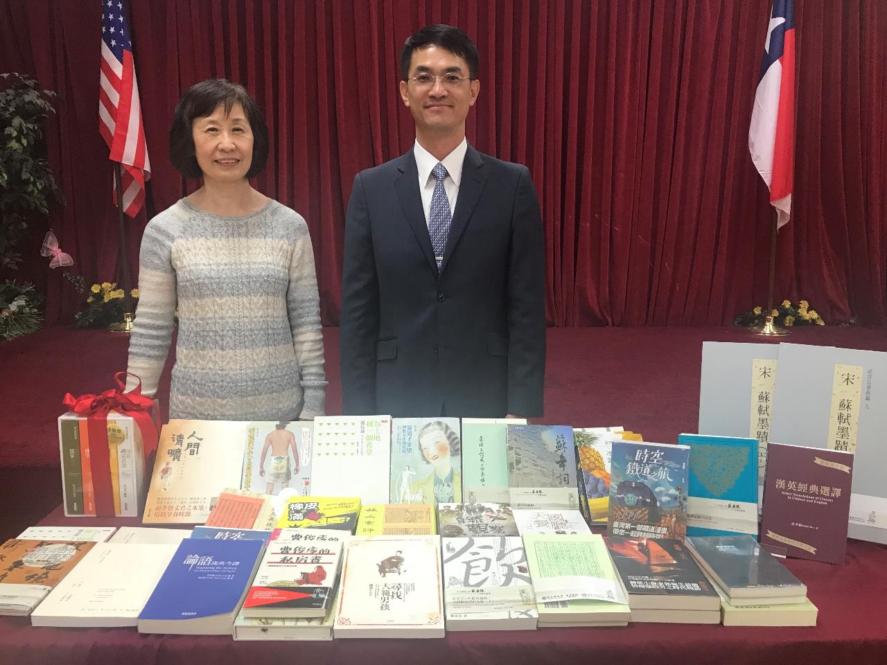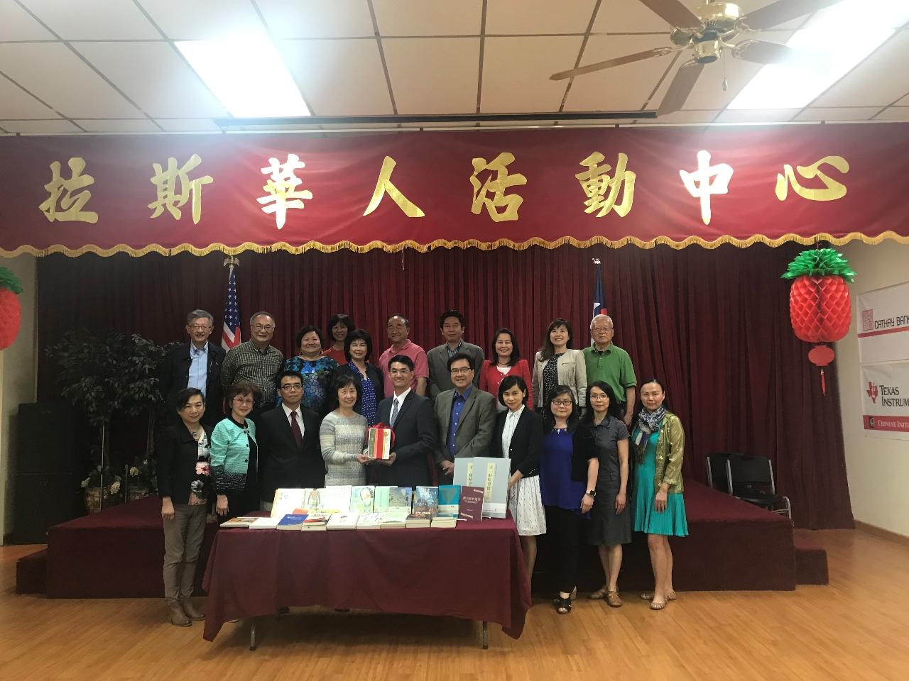 為豐富達拉斯華人活動中心藏書,鼓勵書香閱讀風氣,駐休士頓辦事處陳家彥處長於107年4月13日贈送該中心圖書一批約50餘冊,由中心理事長許祖瑛女士率多位執行理事代表接受。當天現場包括: 李小濱僑務諮詢委員、羅玉昭僑務諮詢委員、曹明宗僑務委員、達福台灣商會李庭槐會長、達拉斯華人活動中心前理事長雷筱鳳女士等當地重要僑界領袖均到場觀禮。