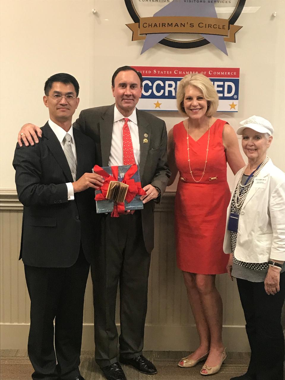 駐休士頓辦事處處長陳家彥(左1)、聯邦眾議員Pete Olson(左2)、眾議員夫人Nancy Olson(右2)、福遍圖書館活動推廣部負責人Joyce Kennerly