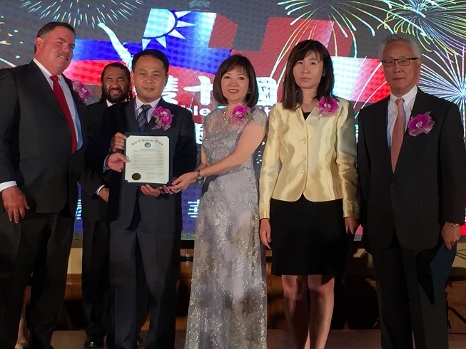 - 駐休士頓辦事處黃敏境處長與國慶籌備會黎淑瑛主任委員等僑領接受德州Bellaire市市長Phil Nauert頒贈祝賀104年國慶文告合影。