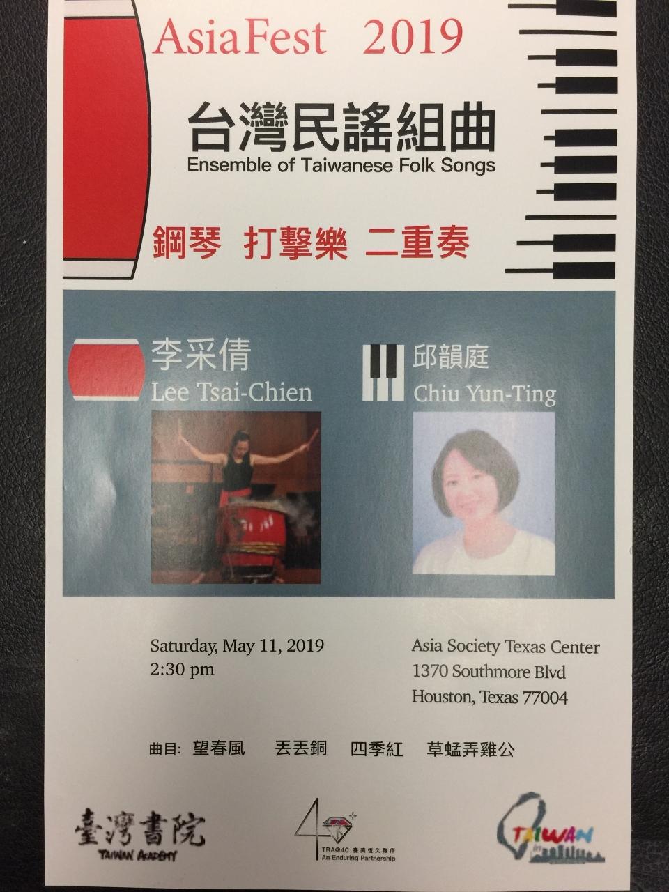 駐休士頓台北經濟文化辦事處台灣書院參與亞洲協會德州中心(Asia Society Texas Center) 5月11日的Asia Fest活動,演出「台灣民謠組曲」,以打擊樂及電子鋼琴合奏方式演奏「望春風」、「草螟弄雞公」、「丟丟銅」、「四季紅」4首台灣家喻戶曉的台灣民謠。