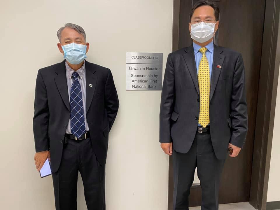 照片1、駐休士頓台北經濟文化辦事處羅復文處長與恆豐銀行張永男總經理在台灣教室前合影。