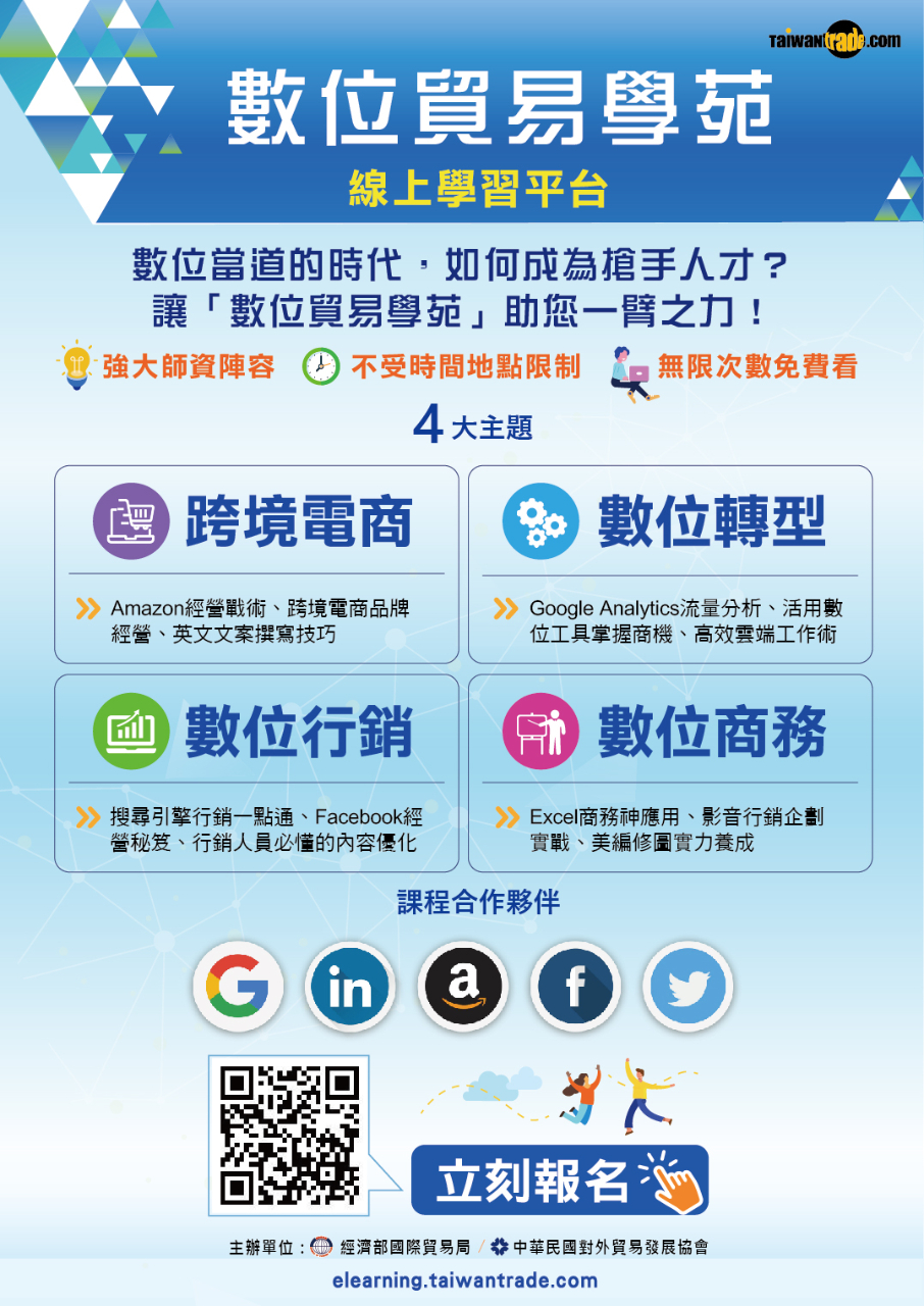 為協助台灣企業運用數位貿易開發商機,經濟部國貿局推出「數位貿易學苑」線上學習平台(網址:http://elearning.taiwantrade.com),該平台涵蓋跨境電商、數位轉型、數位商務與數位行銷等課程;熱門課程有網紅行銷和臉書社群電商導購等,歡迎海外台商登入使用。
