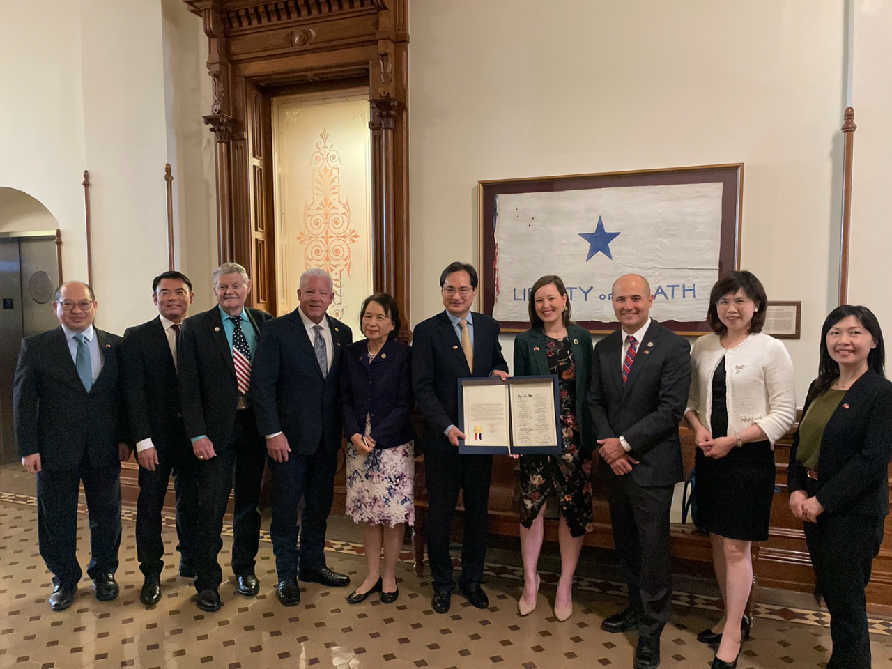 為表達對臺灣之堅定支持,德州議會第88屆參、眾議院頃於日前通過第HCR86號「表達支持強化與臺灣夥伴關係及臺灣在全球角色」之決議案,並在州眾議員Jacey Jetton(R-TX26)及Carl Sherman(D-TX)號召下,於5月25日正式成立本會期跨黨派友台連線(Taiwan Caucus),邀請駐休士頓辦事處羅總領事復文到場接受祝賀,辦事處教育組楊組長淑雅、經濟組倪組長伯嘉、政務組韋副組長天翔及臺灣書院陳副主任譓如亦陪同共襄盛舉。