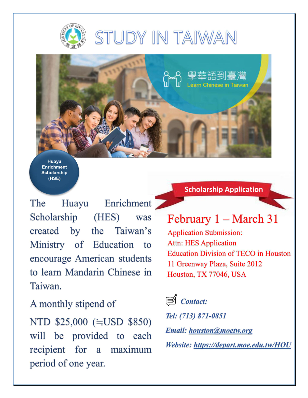 The Huayu Enrichment Scholarship of Taiwan’s Ministry of Education to study Mandarin Chinese in Taiwan is now open for applications for American students from Arkansas, Louisiana, Mississippi, Oklahoma and Texas.