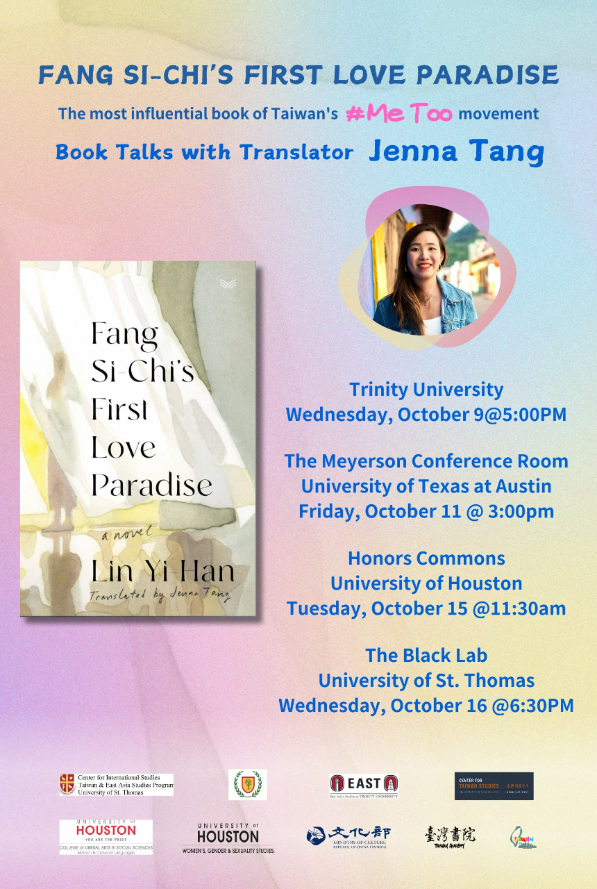 Published in the U.S. by HarperVia in May 2024, Fang Si-Chi’s First Love Paradise, is the most influential book of Taiwan’s #MeToo movement. In collaboration with Taiwan Academy in Houston, Jenna Tang, the book’s translator, will give literary talks at four universities in Texas, including Trinity University, the University of Texas at Austin, the University of Houston and the University of St. Thomas from October 9 to 16.