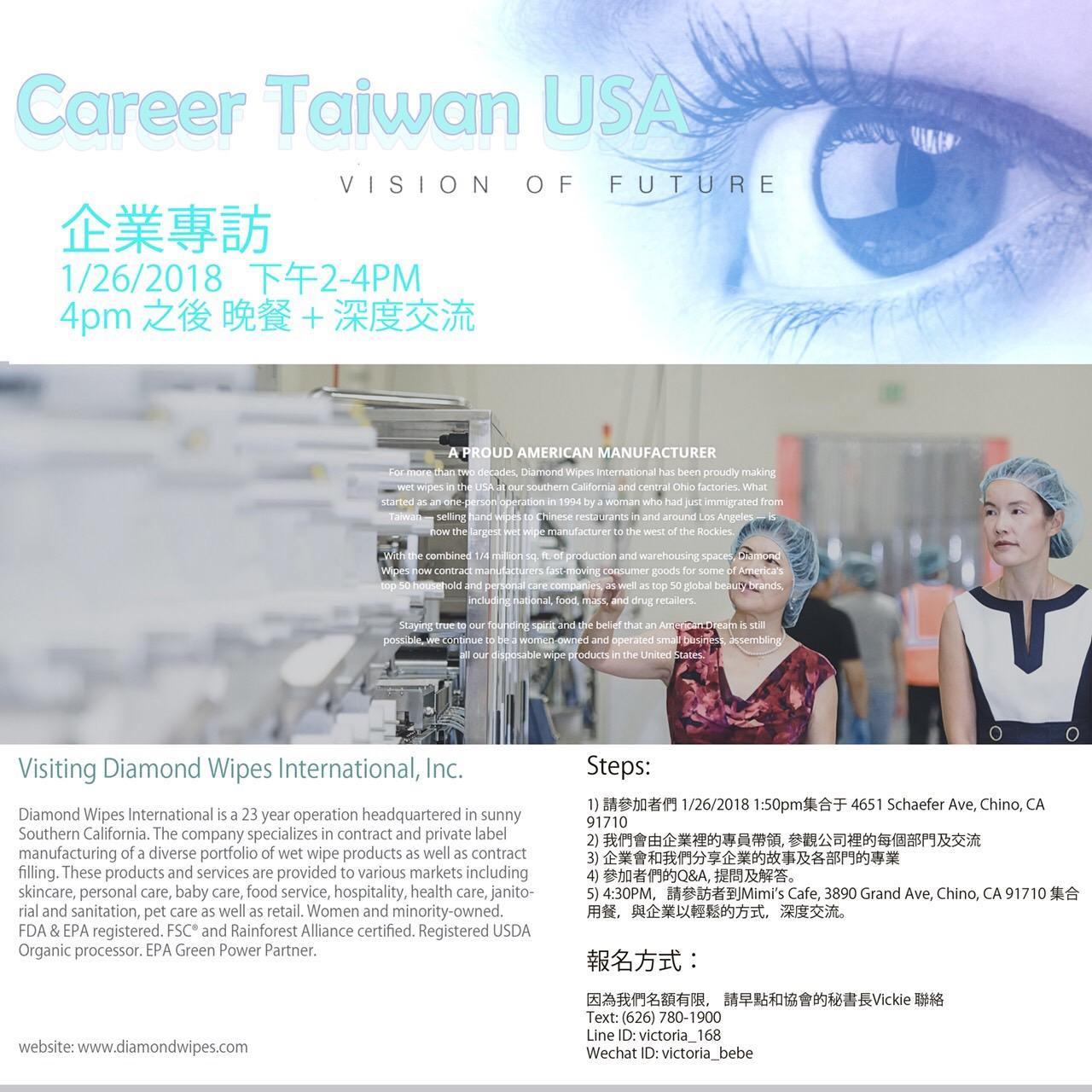 台灣青年美國職涯發展協會(Career Taiwan USA)將在1月26日(星期五)下午舉辦2018年度第一個企業專訪活動,安排拜會由台灣來美創業的成功女性企業家嚴筱意女士的「鑽石國際濕紙巾公司」(Diamond Wipes International, Inc.),看看嚴女士如何將一般人眼人的傳統產業發揚光大,成為掌握全美近八成餐館濕紙巾的市場,而且開發出具有2,000種產品、400名員工及年營業額介於5,000萬至1億元間的企業。現特別開放12個名額給台灣留學生參加,並贊助部份的費用,機會難得,請大家走出校園,踴躍報名,報名方式請詳上方圖檔,先報先得喔!