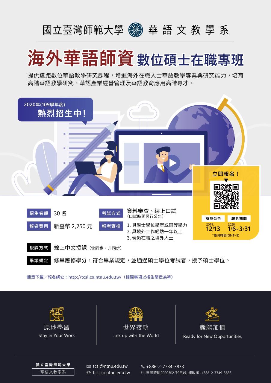 【臺灣師範大學華語文教學系2020年海外華語師資數位碩士在職專班招生資訊】臺師大海外華語師資數位碩士在職專班現正熱烈招生中,臺灣時間2020年1月6日至3月31日開放線上報考!本專班以遠距數位方式授課,使進修不受時空限制,無須舟車勞頓即可與世界各國的華語教師交流學習、得知海外各地華語教學現況,是有志於華語相關產業人士的最佳選擇!招生對象為具一年以上境外工作經驗且現仍在職之境外人士,符合臺灣教育部認可之學士學位或同等學力者皆可報考。錄取名額僅限30名,敬請把握機會!※報名日期:臺灣時間 2020/1/6-3/31※報名網址:https://tcsl.co.ntnu.edu.tw/※考試方式:書面審查&線上口試※聯繫窗口:+886-2-7734-3833 / tcsl@ntnu.edu.tw
