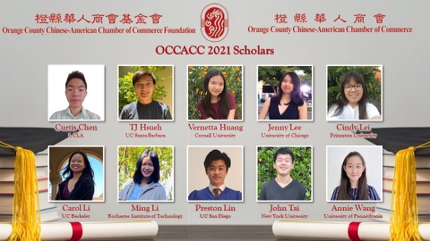 橙縣華人商會基金會於本(2021)年6月12日舉行2021年獎學金線上頒發典禮,獲獎的10位家境清寒、成績傑出的應屆高中畢業生,在就讀大學的4年期間將獲基金會頒發2萬美元總額的獎學金,幫助他們順利完成學業,未來成為在各行各業上成功的人。