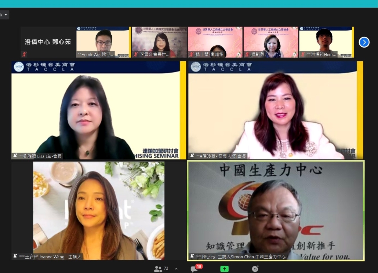 洛杉磯台美商會會於7月11日(星期日)下午舉辦「連鎖加盟研討會-連鎖加盟經營管理實務分享」線上講座,邀請Karat美國餐具製造公司王姿容首席營運長及中國生產力中心陳弘元正管理師主講連鎖加盟經營管理實務分享,約100人上線參與。
