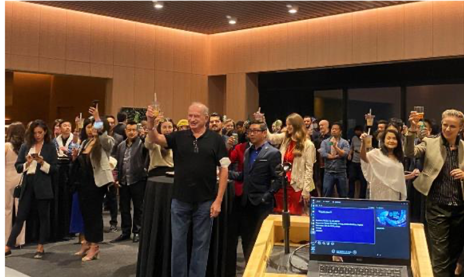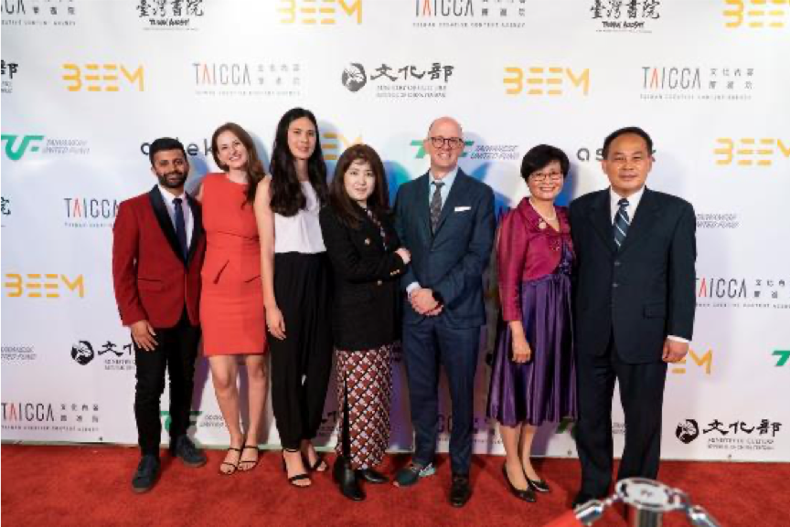 由右至左:駐洛杉磯台北經濟文化辦事處黃敏境處長及夫人、執行製作暨策展人Douglas Montgomery及夫人、台灣人聯合基金會總裁Nikki DePaola、Beem之美國社群與影響力長Tess Fenn及其友人。