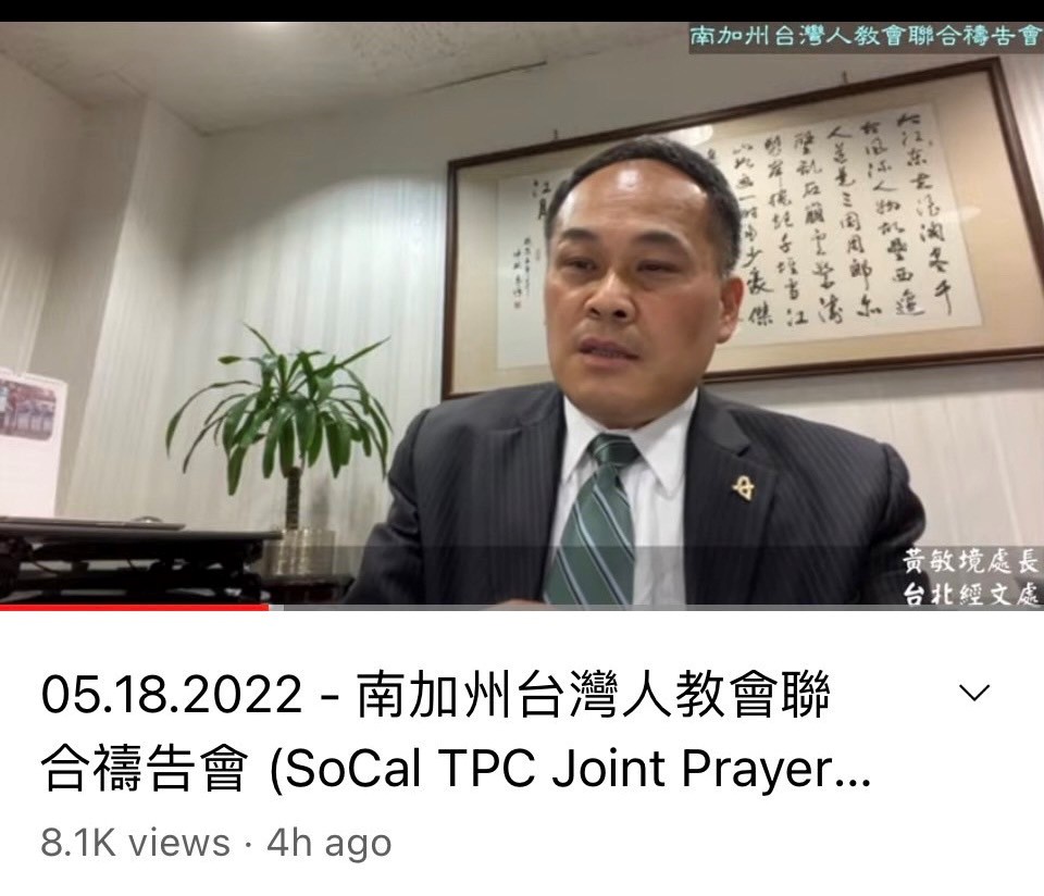 | 美國基督長老教會南加州台灣人長老教會聯合會於本(2022)年5月18日晚間8時為「爾灣台灣基督長老教會」槍擊案受害者舉行視訊禱告會,駐洛杉磯台北經濟文化辦事處黃敏境處長應邀於線上開場致詞,網路現場計有美國各台灣人基督長老教會及台灣基督教會之會眾多人上線。