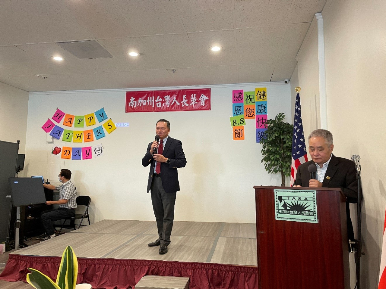 林副處長致詞表示,今天代表黃敏境處長向大家祝賀中秋節及父親節快樂。一般來說,父親節的慶祝活動較無法跟母親節相比,但在美國的長輩們可以過兩次父親節,一次是六月底美國的父親節,一次是八月八日台灣的父親節。林副處長日前發表升任駐檀香山辦事處處長,他也藉這個場合向長輩會的朋友們表示感謝之意,強調雖然即將離任,但在地靈人傑的洛杉磯,每位僑界精英都是他景仰學習的對象,也會帶著這股能量到下一站繼續為台灣打拼,並祝在座長輩身體健康、萬事如意。