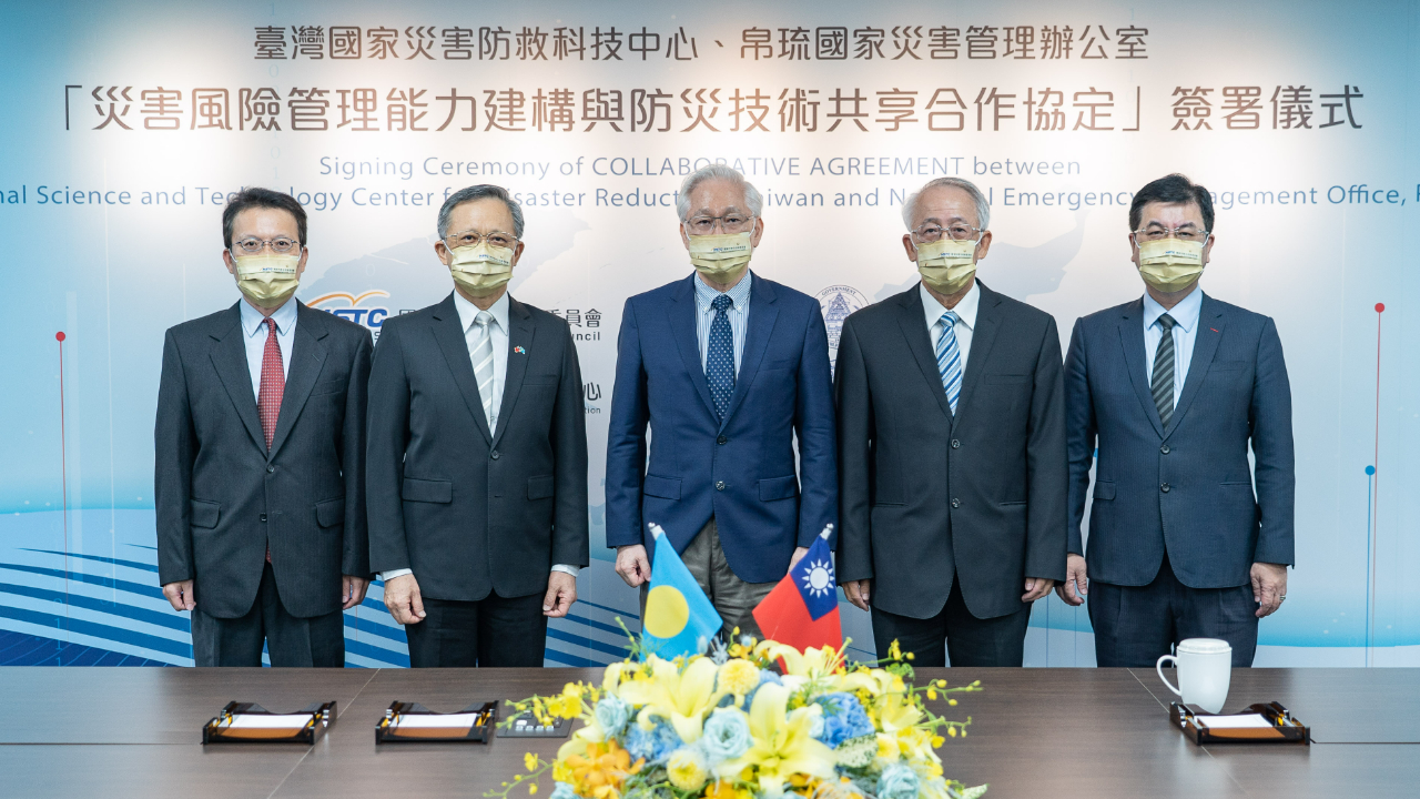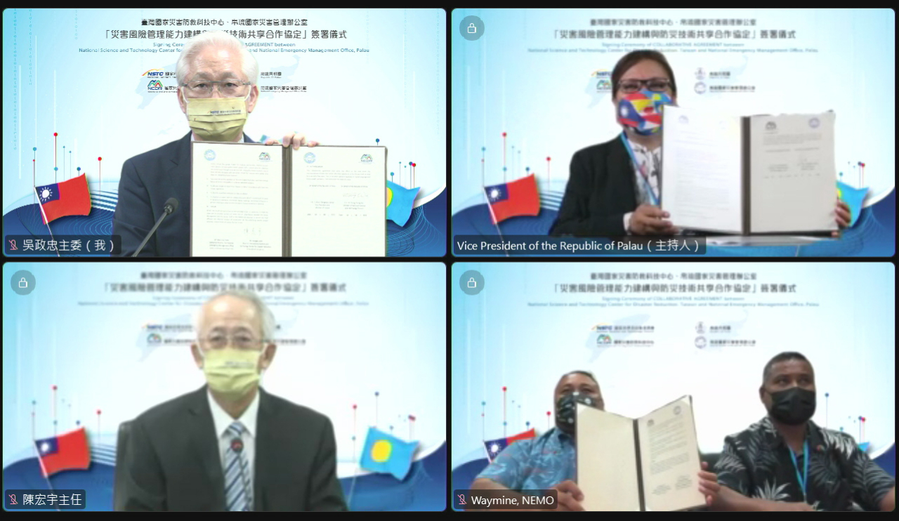 本(2022)年8月30日,國家科學及技術委員會吳政忠主委 (左上)與帛琉席嫵杜副總統 (右上)共同見證,國家災害防救科技中心陳宏宇主任 (左下)與帛琉國家災害管理辦公室陶衛明主任 (右下)簽署「災害風險管理能力建構與防災技術共享合作協定」。