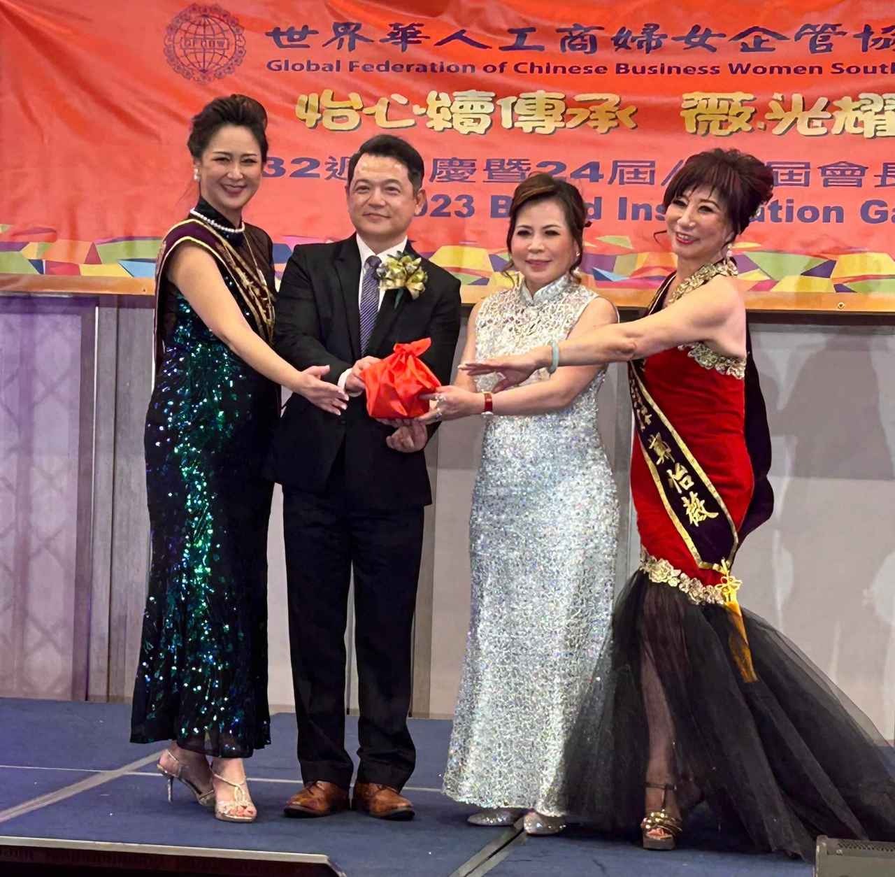 世界華人工商婦女企管協會南加州分會於週日(19日)晚間在San Gabriel Sheraton舉辦「2023年晚會暨新舊會長交接典禮」,紀欽耀處長夫婦受邀出席。