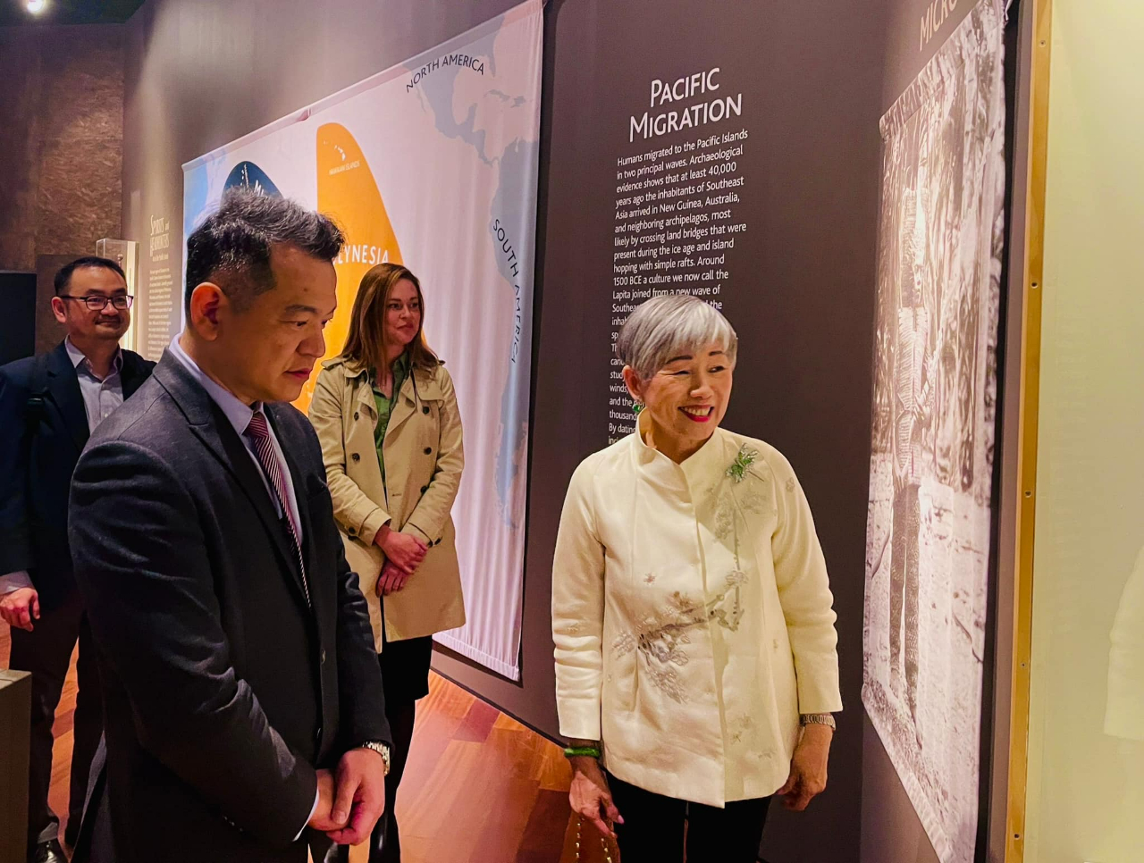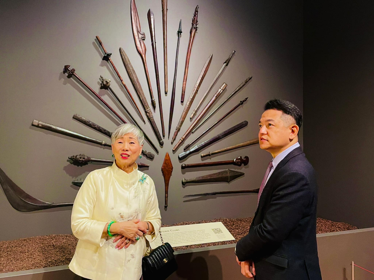 施劉董事長向紀處長介紹南太平洋民族的武器及工具等藏品